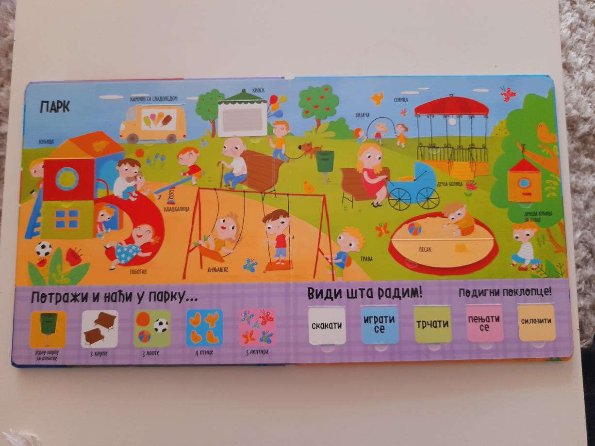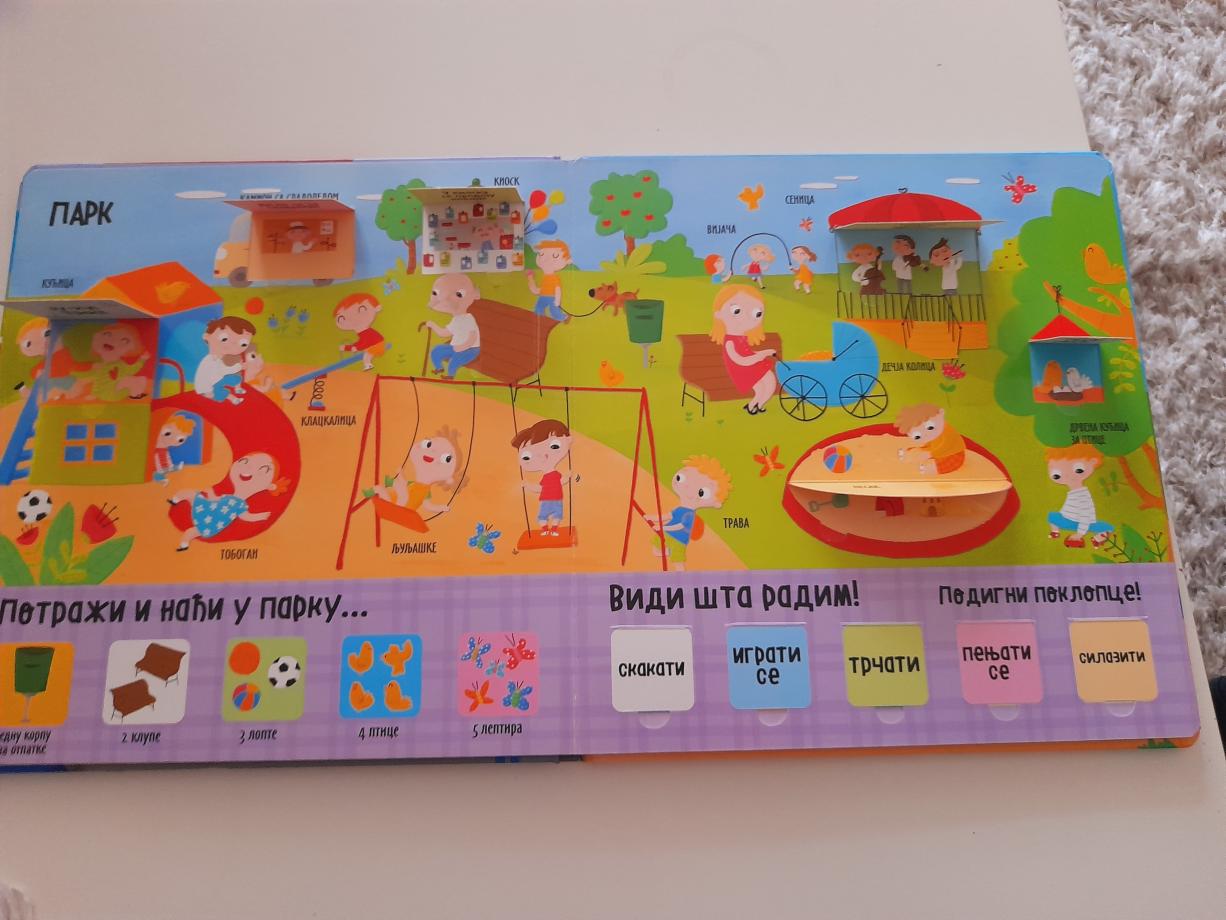 Mališani će satima uživati dok budu otvarali prozorčiće u gradu i učili prve pojmove i reči pomoću zabavnih igara asocijacija: pravljenje parova reči, povezivanje reči i slika, otkrivanje silueta, slaganje slova u reči...