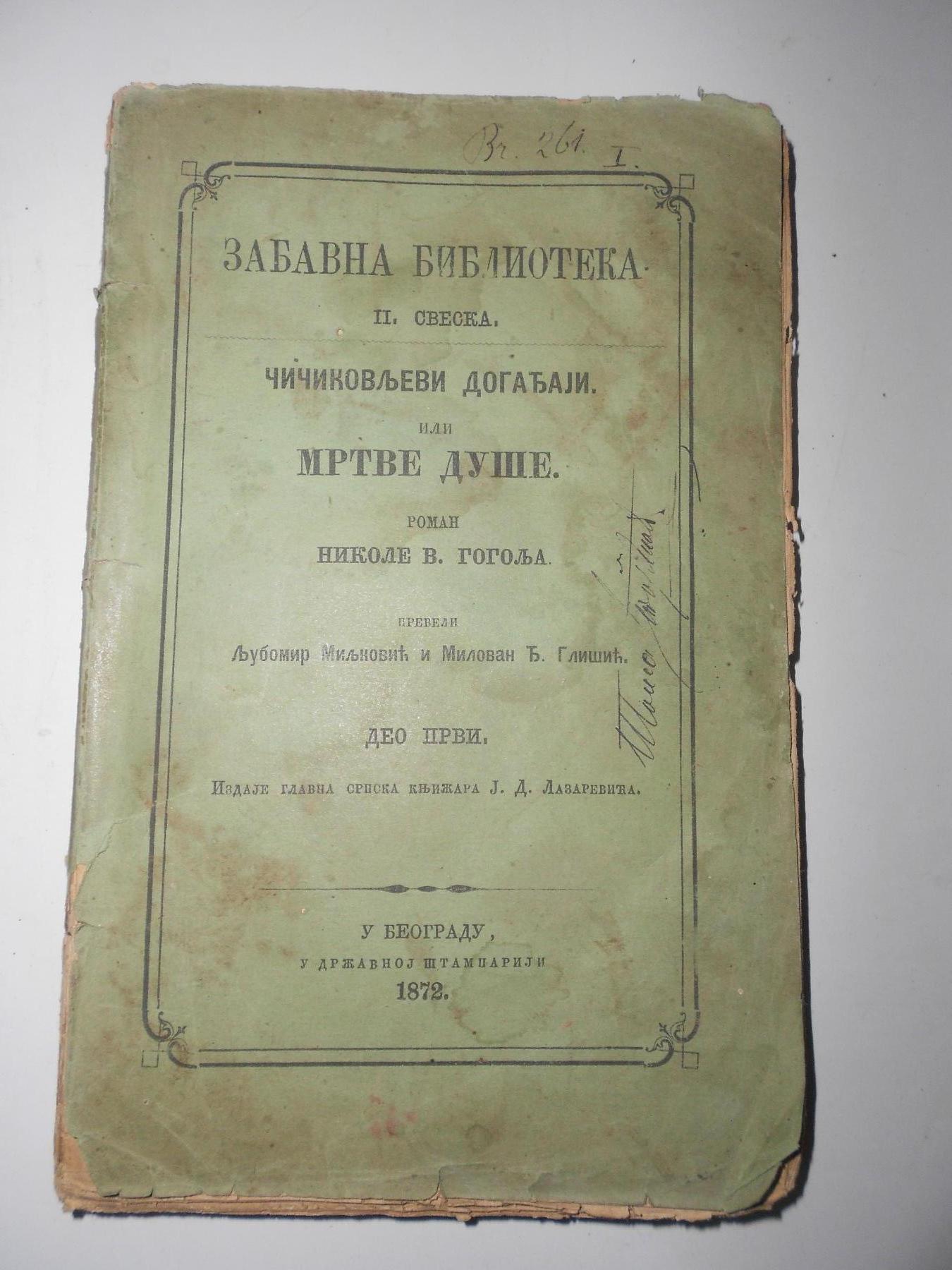 Prodajem knjigu Nikole V. Gogolja "Čičikovljevi događaji ili Mrtve duše - deo prvi". Izdavač Glavna srpska knjižara J.D. Lazarevića u Beogradu 1872. godine. Sa slika.