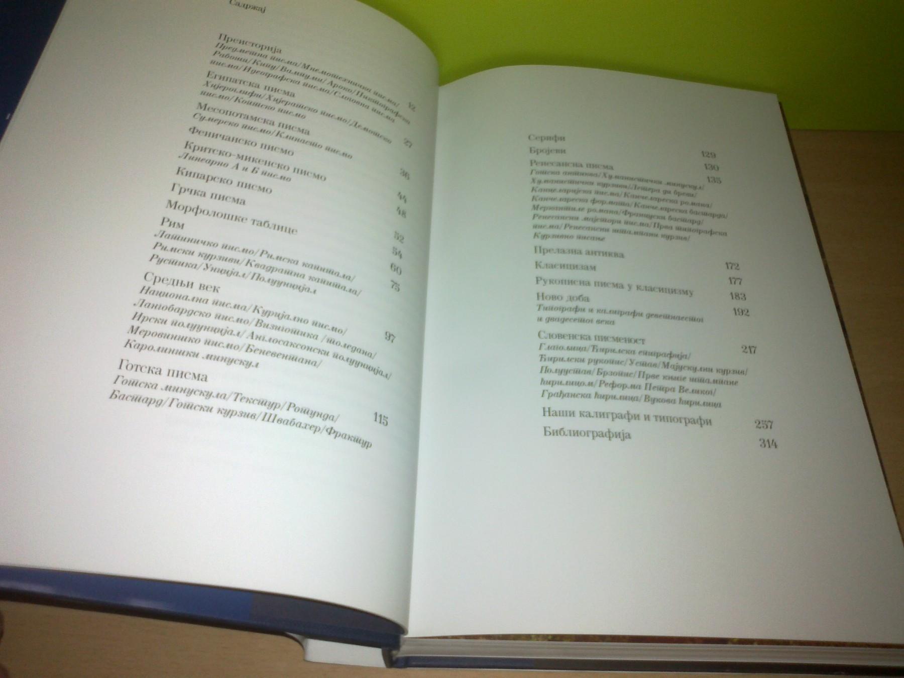 Knjiga govori o nastanku i razvoju pisma, istorijatu latinice i ćirilice, a predstavljeni su izabrani radovi naših eminentnih autora iz oblasti pisma – kaligrafije i tipografije.