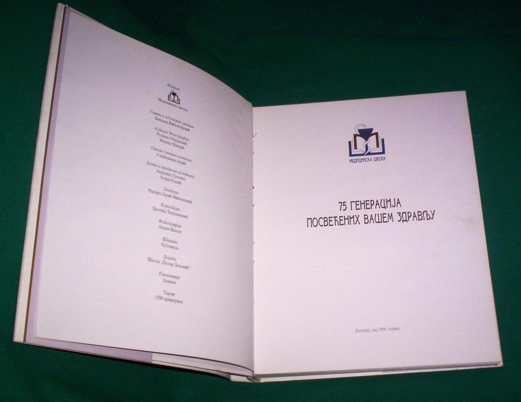 Ružica Obradović-Marija Mandić: 75 GENERACIJA POSVEĆENIH VAŠEM ZDRAVLJU, Medicinska škola, Beograd, 1996, format 22 x 28 cm, strana 287, tvrde korice, povez šivenjem, zaštitni omot, kunstdruk, ilustrovano crno-belim i kolor fotografijama. Istorija i razvoj Medicinske škole u Beogradu od 1921. do 1996. godine. Knjiga je kao nova, bez podvlačenja redova i čistih stranica. Ima pečat vlasnika na predlistu. Ne korespondiram SMS porukama. Ne prodajem knjige kupcima sa Kosova i ne šaljem u inostranstvo. Cena je sa poštarinom. Šaljem samo kao preporučenu tiskovinu.
