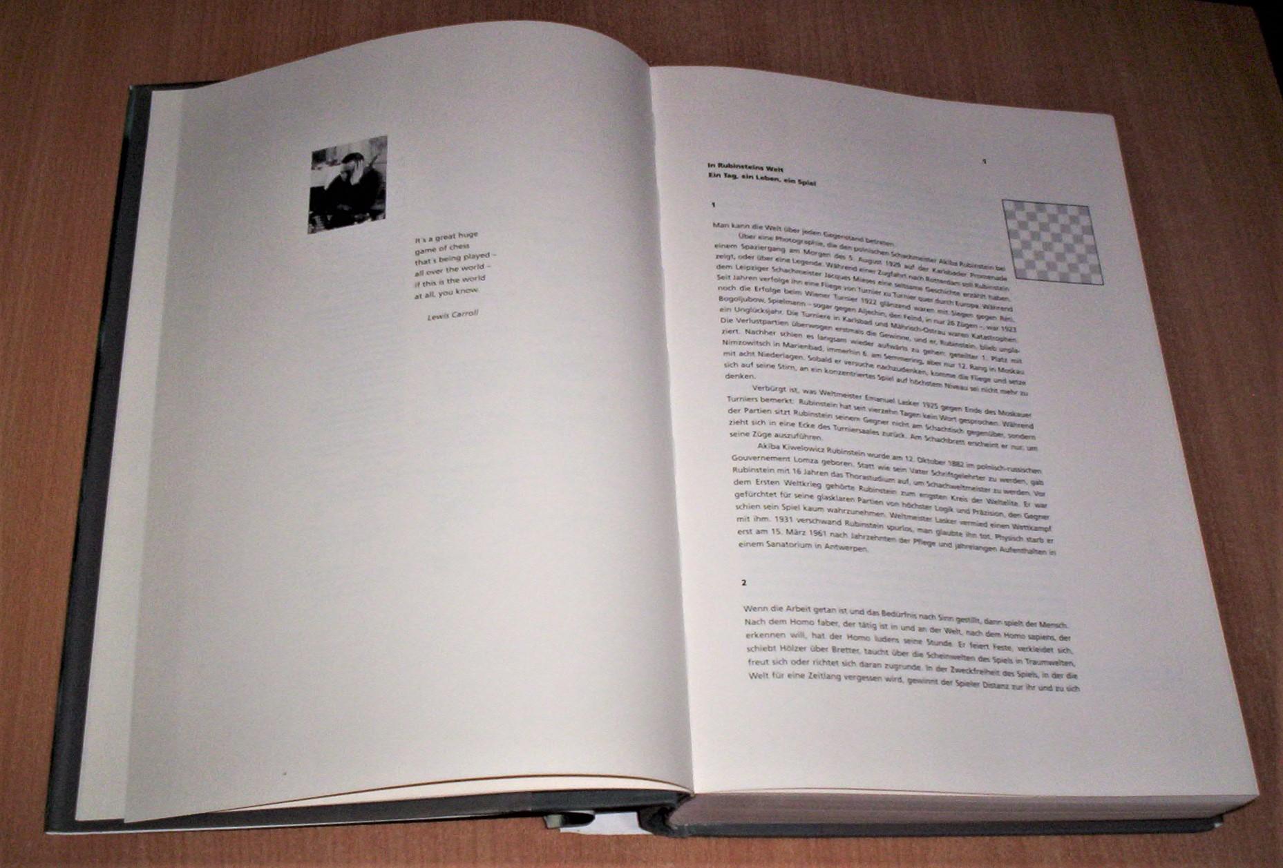 Ernst Strouhal: ACHT x ACHT (ZUR KUNST DES SCHACHSPIELS), Springer Verlag, Wien und New York, Wien, 1996, na nemačkom jeziku, format 22,5 x 32 cm, divot izdanje sa zaštitnim omotom, kožni povez, kunstdruk, strana 463, ilustrovano crno-belim i kolor fotografijama, ima ISBN 3-211-82775-7. Sadržaj knjige: istorija šahovskih mečeva Akibe Kiveloviča Rubinštajna (1882-1961) od 1901. do. 1961. godine (od strane 1-191); ilustrovani atlas sa retkim fotografijama, dokumentima, iluminacijama i grafikama iz 2. veka p.n.e. do 15 veka, sa akvarelima sa šahovskim motivima od 1300. do 1664. godine i razvojem šaha u 14, 15. i 16. veku (od strane 192-327); šahovske partije Rubinštajna od 1901-1945 (strana 329-366), traktati o šahu od 9-11 veka i retki rukopisi iz 1200. godine, sa završnim mečom između Kasparova i Deep Blua u Filadelfiji 1996. (od strane 328-428). Zatim je priložena istorija nastanka šahovskih knjiga od 1496/97 do 1943. (1975) godine (od 429-451 strane). Na kraju knjige nalazi se registar ličnosti i registar šahovskih partija. Knjiga je kao nova, malo korišćena, čistih stranica i bez podvlačenja redova. Ne korespondiram SMS porukama. Ne prodajem knjige kupcima sa Kosova i ne šaljem u inostranstvo. Poštarinu plaća kupac. Šaljem samo kao preporučenu tiskovinu.