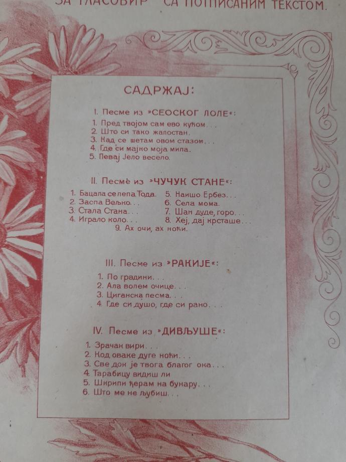 Садржај: Песме из `Сеоског лоле` ; Песме из `Чучук Стане` ; Песме из `Ракије` ; Песме из `Дивљуше`.