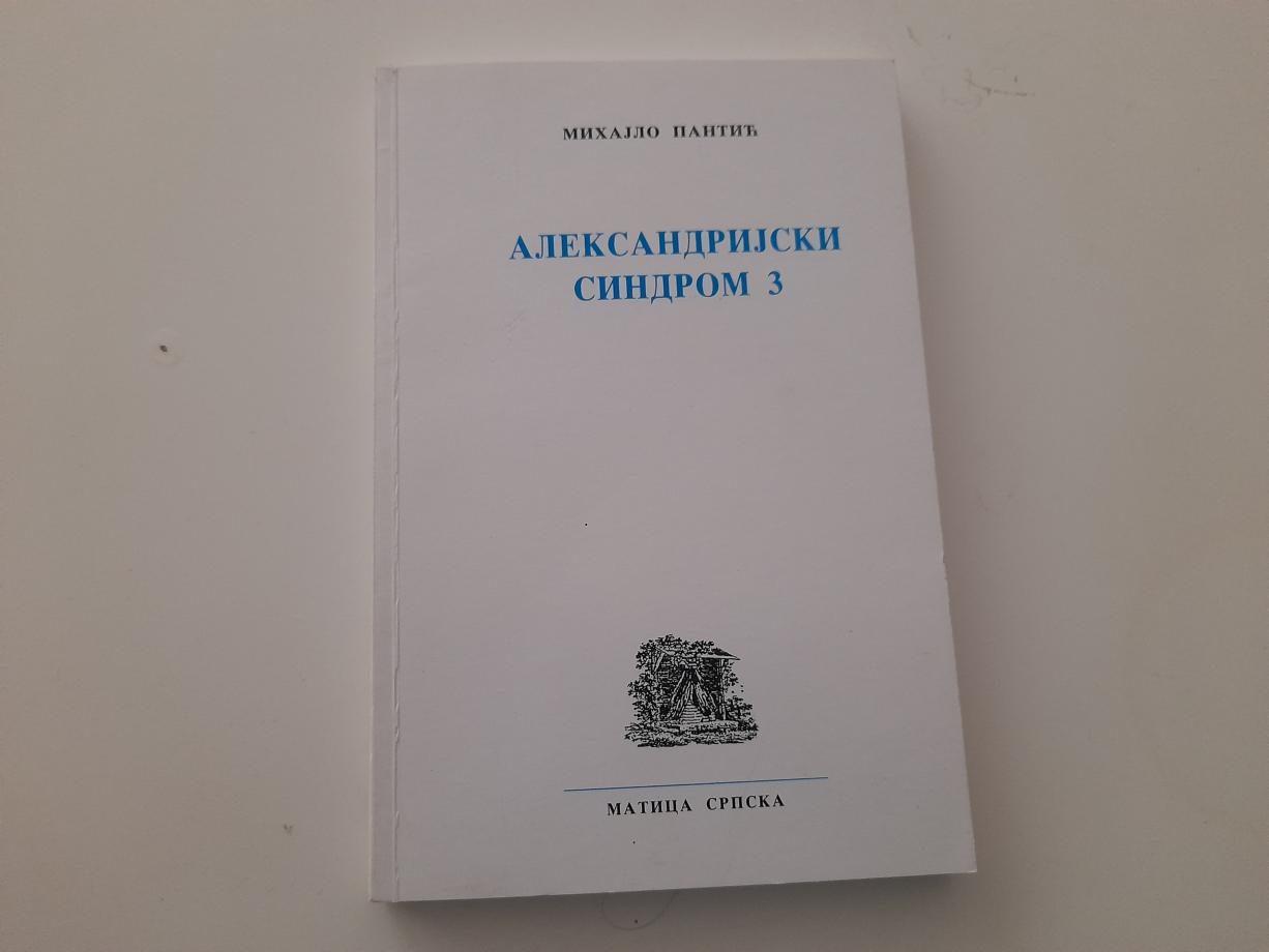 Koliko da podsetimo: samo šesnaest godina posle objavljivanja prvog naslova, bibliografija Mihajla Pantića (1957) nadomak je impozantnih dvadeset. Valjda najagilniji kritičar u svojoj generaciji (knjige kritika, ponajviše eseja i kritika, ogled o Kišu, eseji, dve antologije priča i dr.), Pantić je i visoko rangiran pripovedač (pet zbirki). Aleksandrijski sindrom je, pri tom, treća njegova istovetno naslovljena knjiga. Ovom prilikom sklopljena je od ogleda i kritika o delima savremenih srpskih prozaika. O jednom, dvama, nekolikim delima trideset dva autora. I to u generacijskom rasponu (poetički se podrazumeva) od Isakovića, Tišme, Mihailovića do Valjarevića, Aleksića, Arsenijevića.