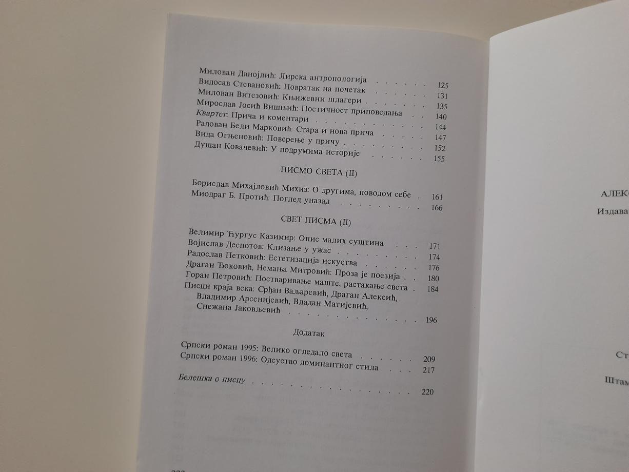 Način grupisanja ogleda i kritika - odeljci `Svet pisma` (I i II) i `Pismo sveta` (I i II) naizmenično su složeni - trebalo bi da nagovesti osnovno poetičko razgraničenje u savremenoj srpskoj prozi. Po čemu se, dakle, Pekićeva, Kišova, Albaharijeva, dela M. Nedića i J. Aćina (obrađena u prvom odeljku) i, potom, osobena memoaristika B. Mihajlovića Mihiza i M. B. Protića (u trećem), bitno razlikuju od desetina knjiga ostalih pisaca o kojima govor ide u drugom i četvrtom odeljku? Reč je, razume se, o shvatanju funkcije književnog teksta: tekst kao `kompletno iskustvo`, iskustvo po sebi, za razliku od manje ili više tradicionalne njegove namene da predstavi `spoljni svet`, spoljašnje iskustvo... Ipak, sva je prilika da je od ove, pojednostavljeno prenesene Stajnerove diferencijacije ovde posredi nešto drugo. Ili, ako hoćemo, nešto izoštrenije postavljeno. U osnovi, dela o kojima piše Pantić promišlja (ne kažemo da ih jedino tako i vrednuje) prema meri autorove privrženosti aleksandrijskom poetičkom ključu. Preovlađuju li u njima mimetičke i njima podobne dimenzije, ili su rezultat `aleksandrijski određenog pripovedanja`.