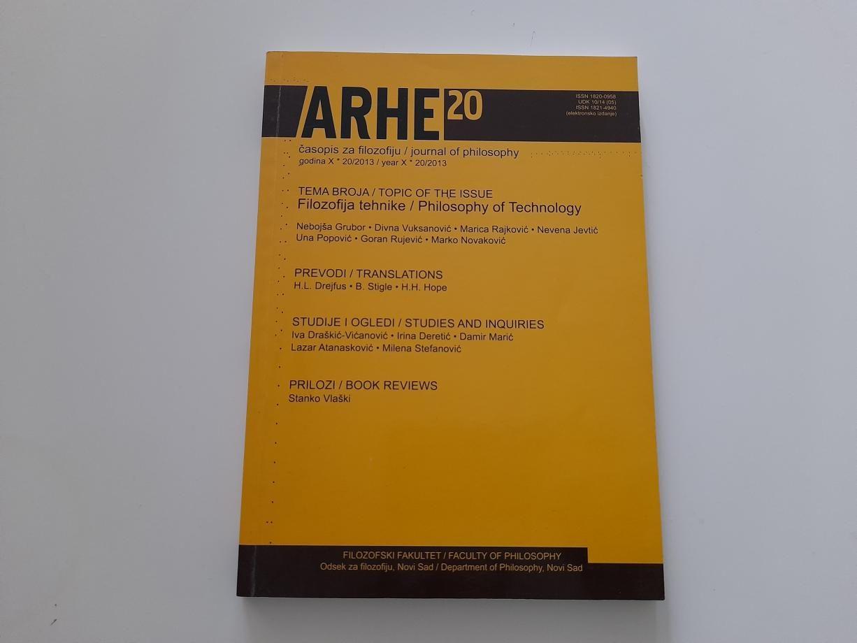 Osnovna tema dvadesete sveske časopisa Arhe posvećena je filozofiji tehnike. Tematski korpus o toj problematici otvara Nebojša Grubor tekstom o ulozi umetnosti u epohi moderne tehnike. Sledi tekst srodne tematske orijentacije Divne Vuksanović o problemu odnosa tehnologije i imaginacije. Marica Rajković istražuje da li je Aristotelovu odredbu čoveka kao zoon politikon u modernom svetu moguće zameniti odredbom zoon technikon. Nevena Jevtić usmerila je svoju istraživačku pažnju na pitanje o tehnici prirode kod Kanta. Da je još uvek filozofski podsticajna tematika Hajdegerove filozofije, posebno njegovi stavovi o tehnici u savremenoj epohi, elaborira Una Popović. Goran Rujević se vraća problematici Jaspersove filozofije, nastojeći da je zahvati iz specifičnog ugla posmatranja mogućnosti odnosa između tehnike i krivice. Napokon, Marko Novaković kroz pitanje o odnosu umetnosti i tehnike još jednom otvara tematiku poznatog spora između Benjamina i Adorna.