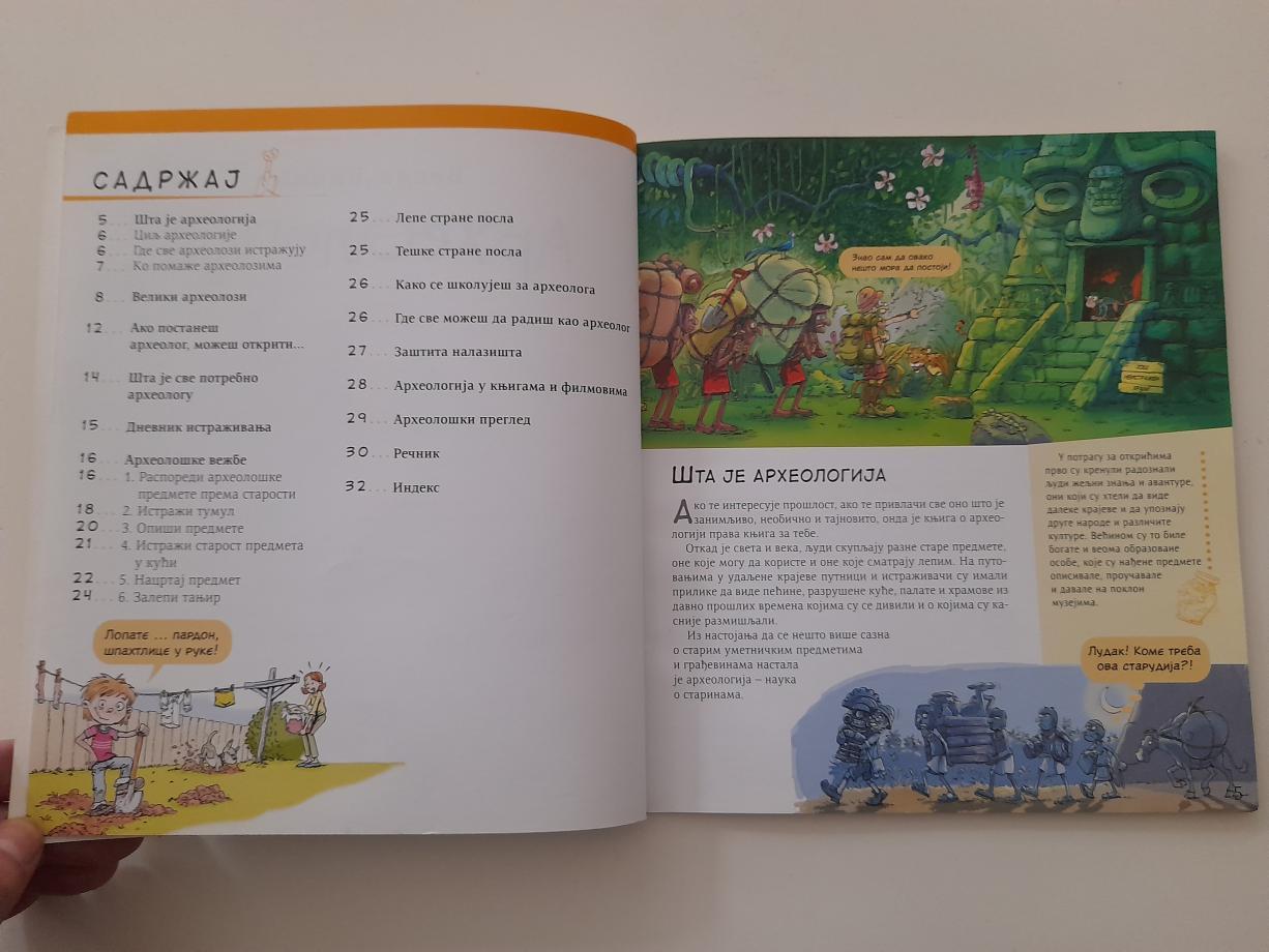 U ovoj slikovnici učenici mogu saznati šta je arheologija, koja su velika otkrića, šta spada u arheološki alat itd. Istovremeno, mali čitaoci dobiće uputstva kako da pokušaju da utvrde starost predmeta, da opišu predmete, naprave dnevnik istraživanja i sami probaju da budu arheolozi.