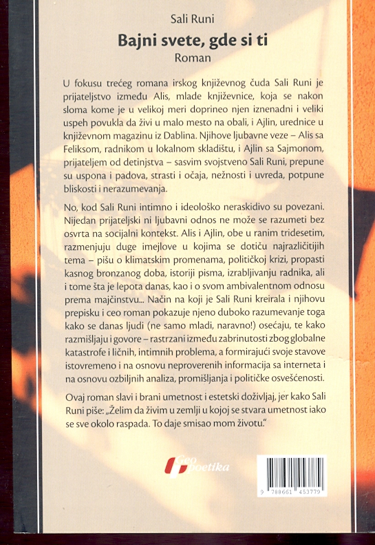 Alis i Ajlin, obe u ranim tridesetim, razmenjuju duge imejlove u kojima se dotiču najrazličitijih tema – pišu o klimatskim promenama, političkoj krizi, propasti kasnog bronzanog doba, istoriji pisma, izrabljivanju radnika, ali i tome šta je lepota danas, kao i o svom ambivalentnom odnosu prema majčinstvu... Način na koji je Sali Runi kreirala i njihovu prepisku i ceo roman pokazuje njeno duboko razumevanje toga kako se danas ljudi (ne samo mladi, naravno!) osećaju, te kako razmišljaju i govore – rastrzani između zabrinutosti zbog globalne katastrofe i ličnih, intimnih problema, a formirajući svoje stavove istovremeno i na osnovu neproverenih informacija sa interneta i na osnovu ozbiljnih analiza, promišljanja i političke osvešćenosti.’’