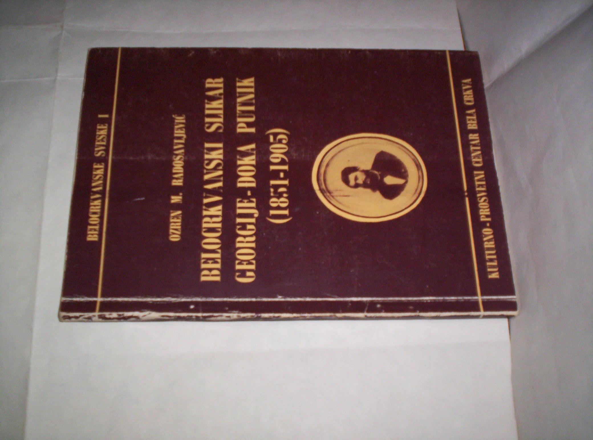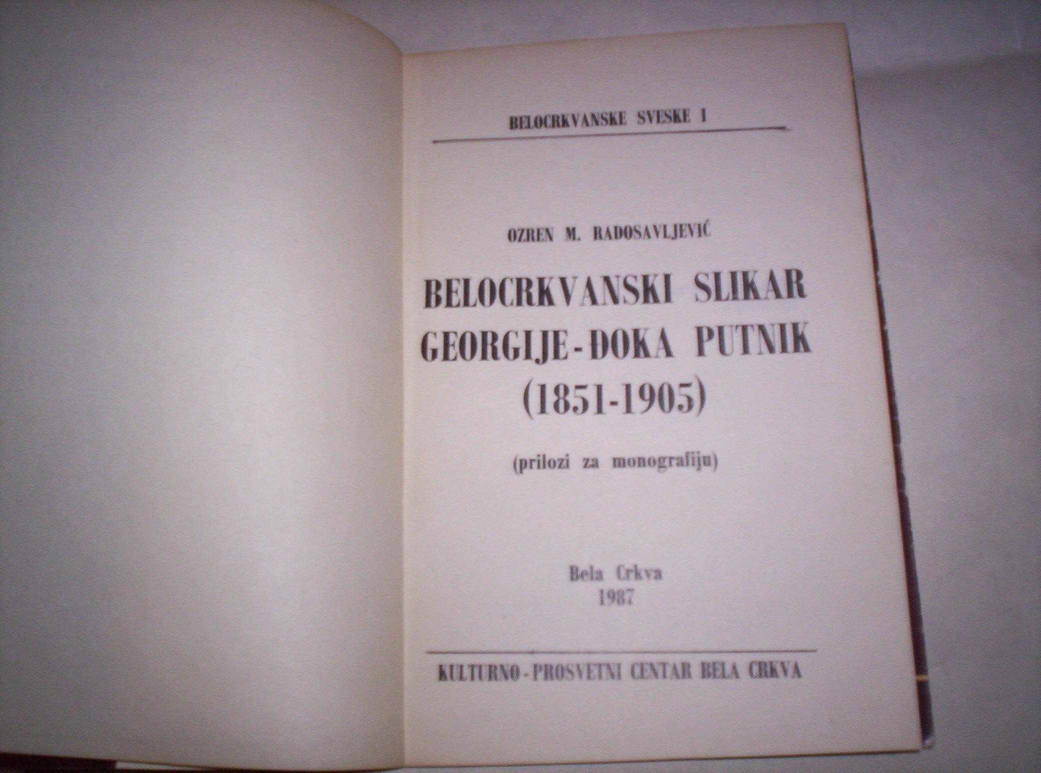 Ozren M. Radosavljević: BELOCRKVANSKI SLIKAR GEORGIJE-ĐOKA PUTNIK(1851-1905), Prilozi za monografiju, Kulturno-prosvetni centar, Bela Crkva, 1987, format 14 x 20,5 cm, strana 39 + 10, ilustrovano crno-belim fotografijama, korice sa klapnama, broširan povez. Stranice čiste, bez mrlja i bez podvlačenja redova. Prvo delo o legendarnom belocrkvanskom slikaru i ikonopiscu. Plaćanje unapred. Ne korespondiram SMS porukama i ne prodajem kupcima sa Kosova i ne šaljem u inostranstvo. Kupci iz Bele Crkve mogu preuzeti predmet kod vlasnika. Kupac plaća poštarinu.