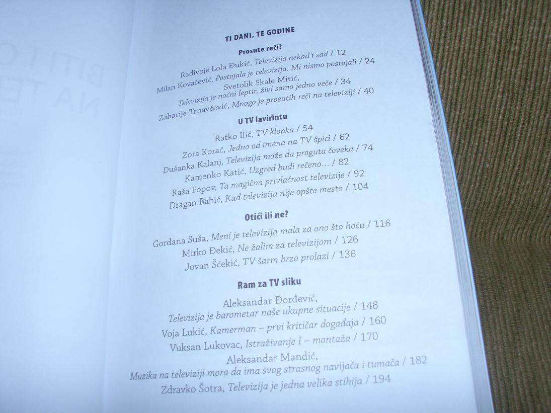 Neki od intervjuisanih TV autora: Radvoje Lola Djukić, Milan Kovačević, Svetolik Mitić, Zaharije Trnavčević, Zora Korać, Dragan Babić, Kamenko Katić, Raša Popov,Jovan Šćekić, Gordana Suša, Zdravko Šotra, Silvija Luks, Goran Milić, Anton Marti, Sanda Langerholc.....