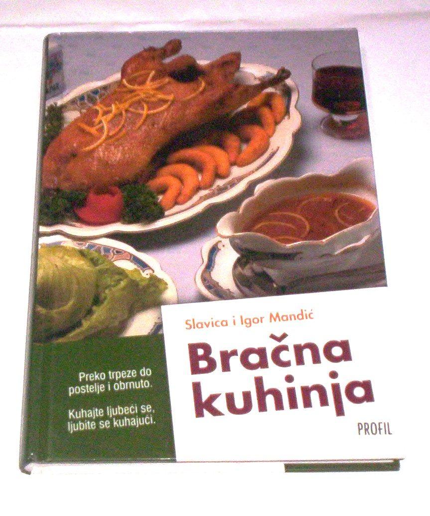 Slavica i Igor Mandić: BRAČNA KUHINJA, Profil international, Zagreb, 1989, tvrde korice, na hrvatskom, format 17 x 24 cm, strana 200, kunstdruk, ilustrovano fotografijima u punom koloru, ima ISBN 953-12-0340-7. Knjiga sadrži 240 recepata, počev od predjela, preko jela od testetine, pirinča, gljiva, jaja, mesa, suflei, supa i čorbe, variva, riba i morskih plodova do divljači. U glavna jela autori preporučuju ona od govedine, teletine, svinjetine, janjetine i peradi. Zadnji deo knjige je posvećen kolačima, poslasticama i voćnim tortama. Malo korišćen primerak, čistih stranica i bez podvlačenja redova. Na predlistu ima posveta. Ne korespondiram SMS porukama. Ne prodajem knjige kupcima sa Kosova i ne šaljem u inostranstvo. Poštarinu plaća kupac. Šaljem samo kao preporučenu tiskovinu.
