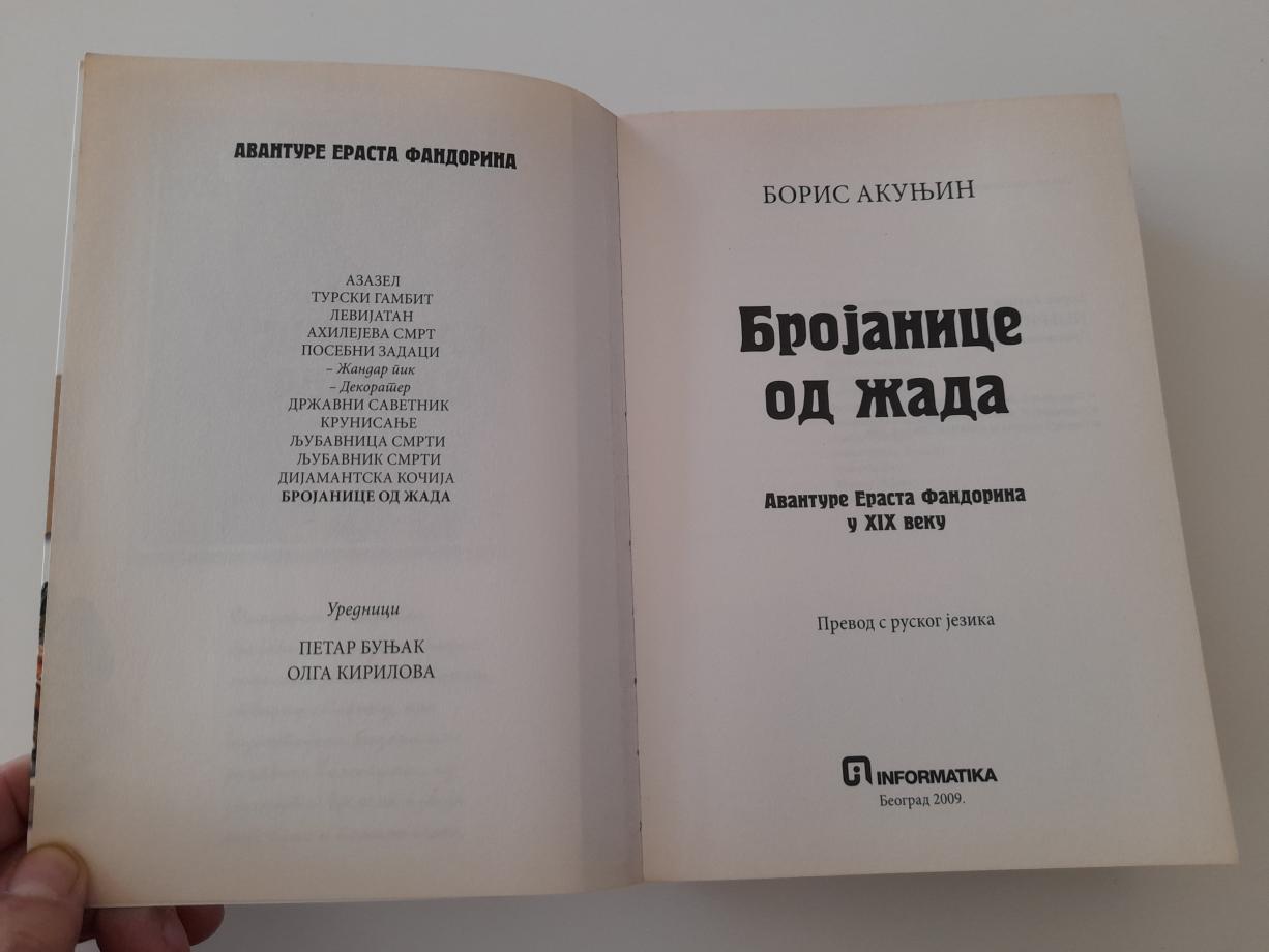 Brojanice od žada je hronika života Erasta Petroviča u poslednjoj deceniji XIX veka, sastavljena od tri veće i sedam manjih novela. Knjiga je, u već prepoznatljivom stilu Informatikinih izdanja, ilustrovana fotografijama i slikama vezanim za kulturni kontekst opisanog istorijskog vremena ili sakriveni smisao priča, i propraćena temeljito urađenim Pojmovnikom.