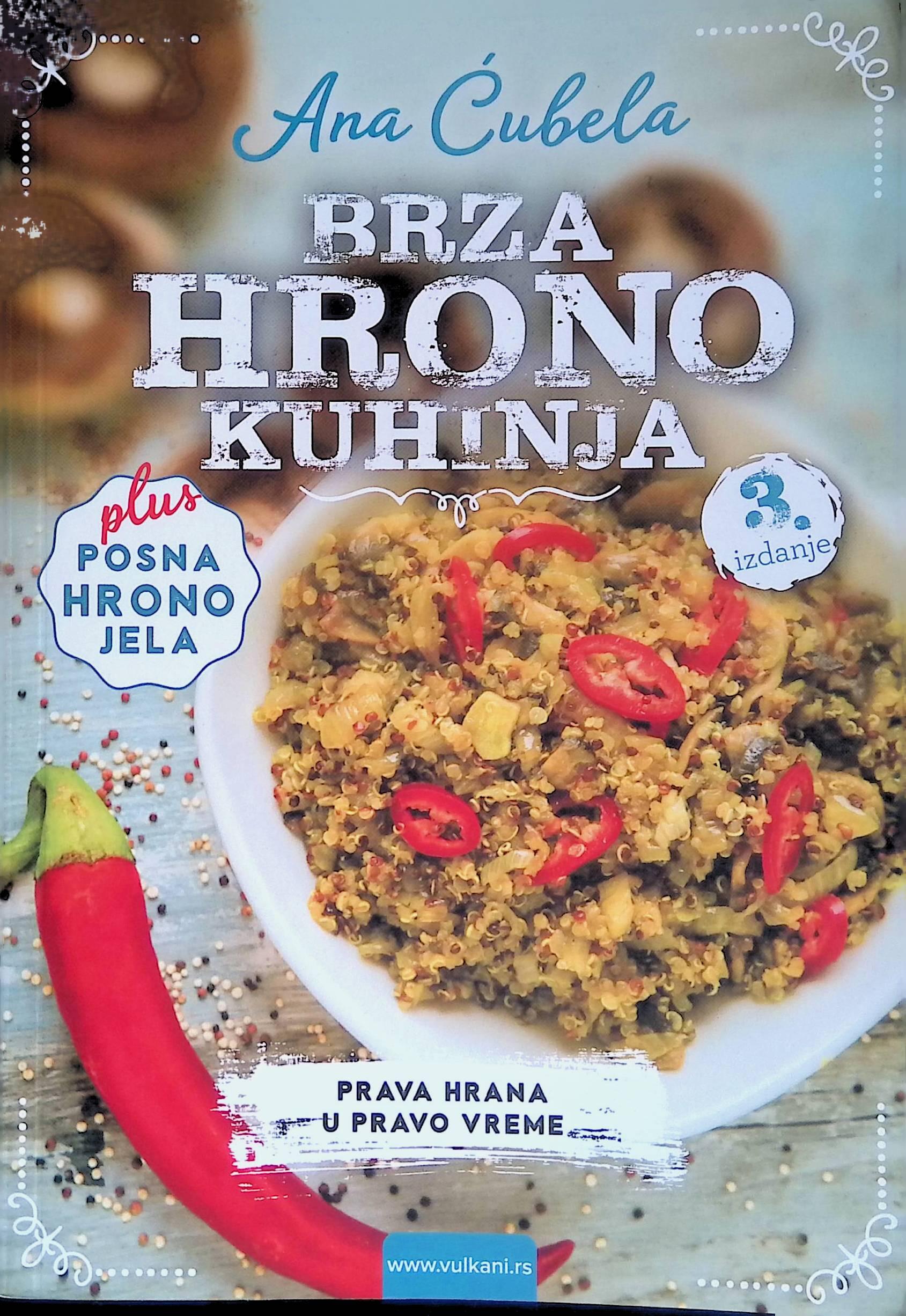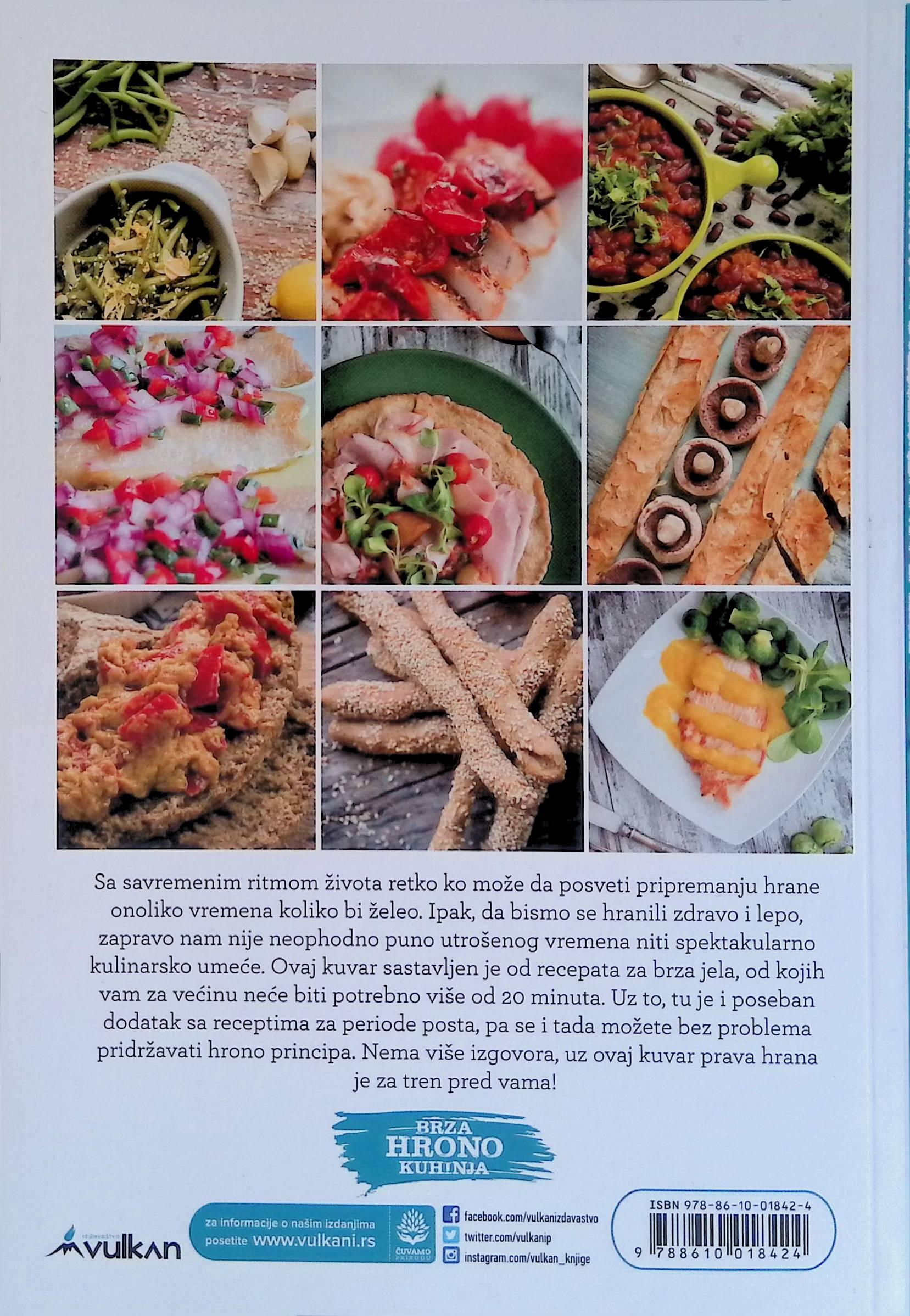 Brza hrono kuhinja je zbirka recepata za jela koja se spremaju najviše 20 minuta. Uz kuvar se nalazi i dodatak za pripremu posnih jela, pa možete i u tom periodu da se pridržavate hrono ishrane.
