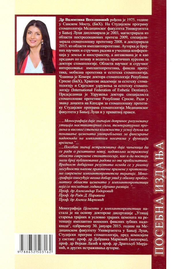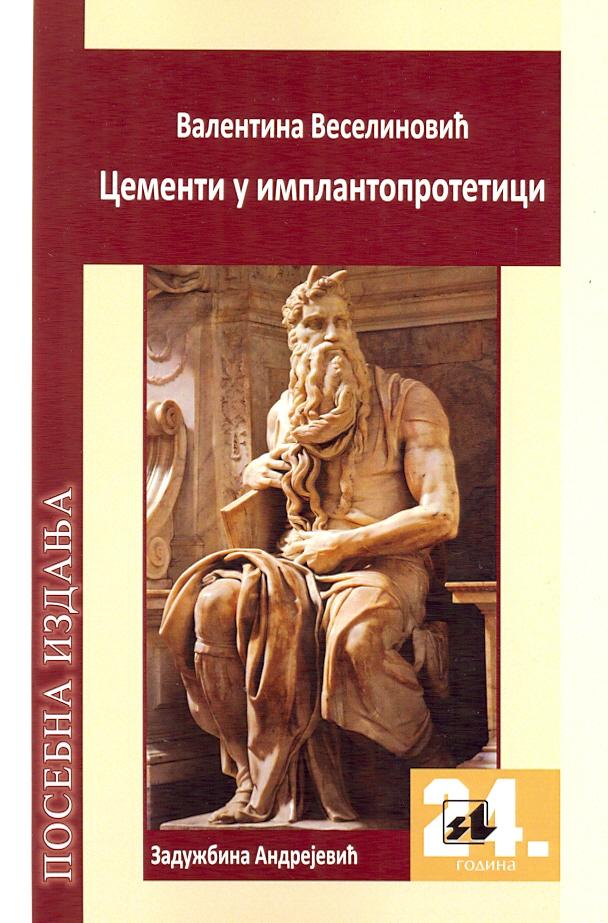 Knjiga "Cementi u implantoprotetici" autorke Valentine Veselinović predstavlja stručnu, detaljno obrađenu studiju o jednoj od ključnih komponenti savremene stomatološke protetike – upotrebi cementa u fiksiranju protetskih radova na implantatima. Kroz sistematski i jasno strukturisan pristup, autorka vodi čitaoca kroz sve aspekte ove važne teme, počev od osnovnih karakteristika različitih vrsta cementa, njihovih fizičko-hemijskih svojstava, indikacija i kontraindikacija za upotrebu, pa sve do specifičnih zahteva koje nameću radovi na implantatima u odnosu na radove na prirodnim zubima. Posebna pažnja posvećena je razlikama između privremenih i trajnih cementa, njihovim prednostima i potencijalnim rizicima, kao i izazovima koje cementacija nosi za dugoročan uspeh implantoprotetskih radova, uključujući problematiku retencije, rešavanje komplikacija i prevenciju periimplantitisa uzrokovanog zaostalim cementom.