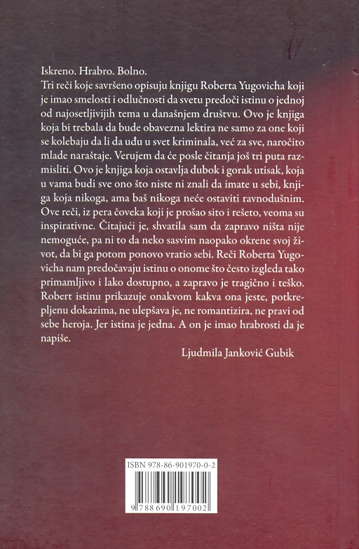 "Tri reči koje savršeno opisuju knjigu Roberta Yugovicha koji je imao smelosti i odlučnosti da svetu predoči istinu o jednoj od najosetljivijih tema u današnjem društvu. Ovo je knjiga koja bi trebala da bude obavezna lektira ne samo za one koji se kolebaju da li da uđu u svet kriminala, već za sve, naročito mlade naraštaje. Verujem da će posle čitanja još tri puta razmisliti. Ovo je knjiga koja ostavlja dubok i gorak utisak, koja u vama budi sve ono što niste ni znali da imate u sebi, knjiga koja nikoga, ama baš nikoga neće ostaviti ravnodušnim. Ove reči, iz pera čoveka koji je prošao sito i rešeto, veoma su inspirativne. Citajući je, shvatila sam da zapravo ništa nije nemoguće, pa ni to da neko sasvim naopako okrene svoj život, da bi ga potom ponovo vratio sebi. Reči Roberta Yugovicha nam predočavaju istinu o onome što često izgleda tako primamljivo i lako dostupno, a zapravo je tragično i teško. Robert istinu prikazuje onakvom kakva ona jeste, potkre- pljenu dokazima, ne ulepšava je, ne romantizira, ne pravi od sebe heroja. Jer istina je jedna. A on je imao hrabrosti da je napiše."