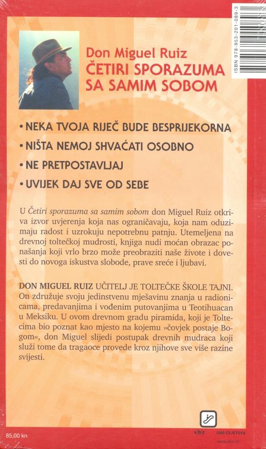 U "Četiri sporazuma sa samim sobom" Don Miguel Ruiz otkriva izvor uvjerenja koja nas ograničavaju, koja nam oduzimaju radost i uzrokuju nepotrebnu patnju. Utemeljena na drevnoj toltečkoj mudrosti, "Četiri sporazuma sa samim sobom" nude moćan obrazac ponašanja koji vrlo brzo može preobraziti naše živote i dovesti do novog iskustva slobode, prave sreće i ljubavi.