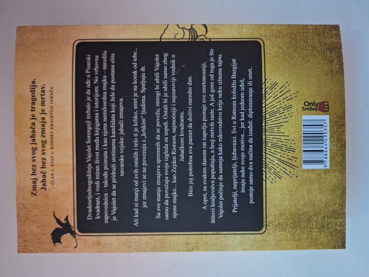 Dvadesetjednogodišnja Vajolet Sorengejl trebalo je da uđe u Pisarski kvadrant, i vodi miran život među knjigama i istorijom. No vrhovna zapovednica – takođe poznata i kao njena nemilosrdna majka – naredila je Vajolet da se pridruži stotinama kandidata koji žele da postanu elita navarske vojske: jahači zmajeva. Ali kad si manji od svih ostalih i telo ti je krhko, smrt je na korak od tebe… jer zmajevi se ne povezuju s „krhkim“ ljudima. Spaljuju ih. Sa sve manje zmajeva spremnih da se povežu, mnogi bi ubili Vajolet samo da povećaju svoje izgleda za uspeh. Ostali bi je ubili samo zbog njene majke… kao Zejden Riorson, najmoćniji i najsuroviji vodnik u Jahačkom kvadrantu.