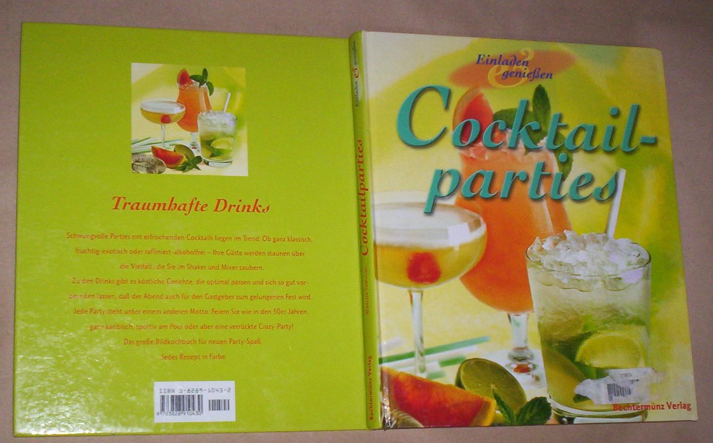 Marlisa Szwillus: COCTTAIL PARTIES (Einladen 3 Geniessen), Bechtermünz Verlag, Augsburg, 1999, na nemačkom jeziku, format 22,5 x 27 cm, strana 120, tvrde korice, kunstdruk, 110 fotografija u koloru. Autor fotografije je Klaus Arras. Knjiga ima ISBN 3-8289-1043-2. Izbor pića i vrste alkohola, izbor jela, dekorisanje stolova, saveti za letnje noćne traume, izbor i vrsta čaša za matinee, izbor adekvatnog prostora, svetla i osvetljenja. „Dobro planiranje je pola posla“, navodi autor. Malo korišćen primerak, gotovo kao nov, bez podvlačenja redova i čistih stranica. Šaljem po uplati. Ne korespondiram SMS porukama. Ne prodajem knjige kupcima sa Kosova i ne šaljem u inostranstvo. Kupac plaća poštarinu.