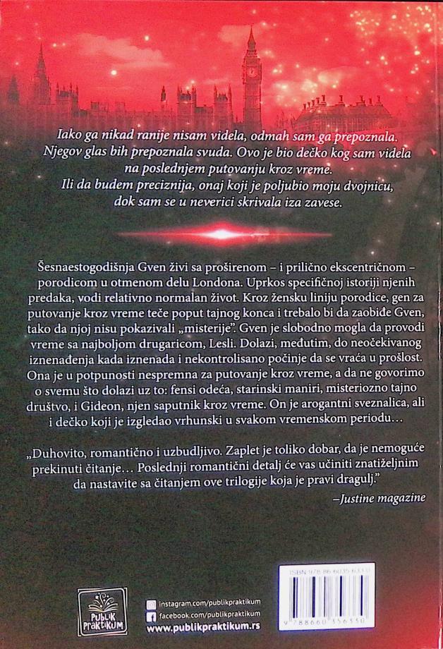 Ženska linija njene porodice poseduje gen koji im omogućava da putuju kroz vreme. Međutin, Gven taj gen treba da zaobiđe tako da je članovi porodice nisu uveli u porodične tajne. Međutim, ona će iznenada i sasvim neočekivano da počne da putuje u prošlost. Ona za to apsolutno nije spremna. Tada se pojavljuje i Gideon, njen saputnik na tim putovanjima kroz vreme...