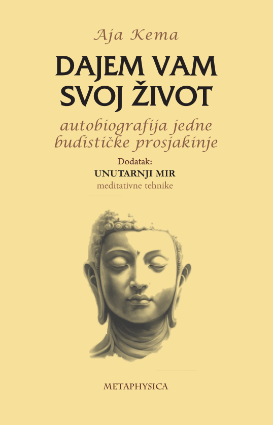 Knjiga „Dajem vam svoj život & Unutarnji mir / meditativne tehnike“ donosi intimno i nadahnuto svedočanstvo duhovnog puta jedne od najpoznatijih budističkih učiteljica Zapada, Aje Keme. U prvom delu autorica govori o sopstvenom životu, koji je bio ispunjen neobičnim iskustvima, putovanjima i promenama, ali i dubokim unutrašnjim traganjem za smislom. Kroz iskrenu i neposrednu ispovest ona pokazuje kako se život često odvija mimo naših planova, vodeći nas kroz različite uloge i okolnosti koje tek kasnije dobijaju svoje pravo značenje. Njena životna priča vodi od detinjstva i porodičnog života, preko brojnih putovanja i iskušenja, do trenutka kada pronalazi duhovni put i odlučuje da se posveti budističkoj praksi, prihvatajući monaški život kao način potpunog oslobađanja od vezanosti.