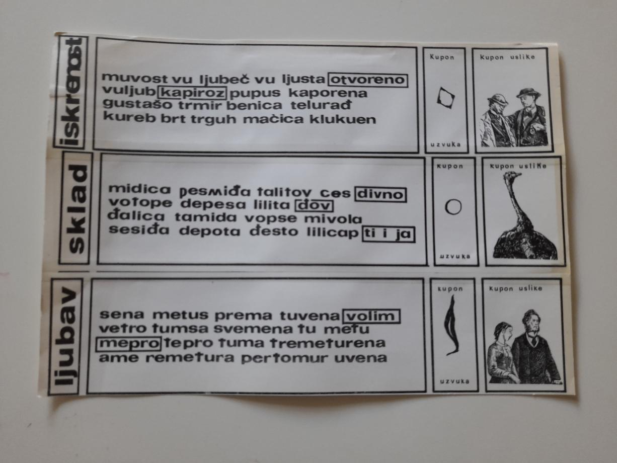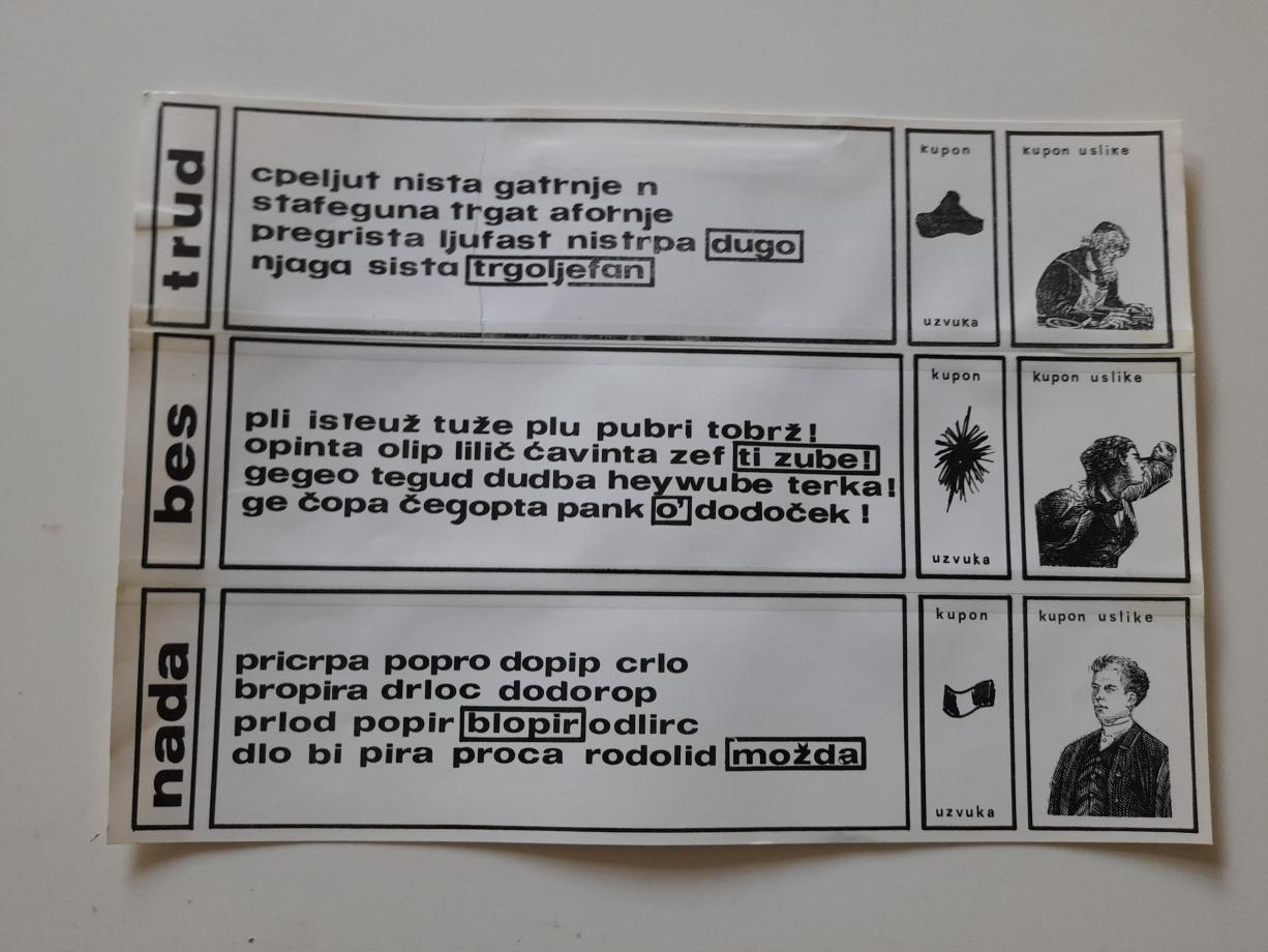 Dnjižepta bibil zizra uhunt - elementarne pesme, jezička i vizuelna supstanca doživljaja.