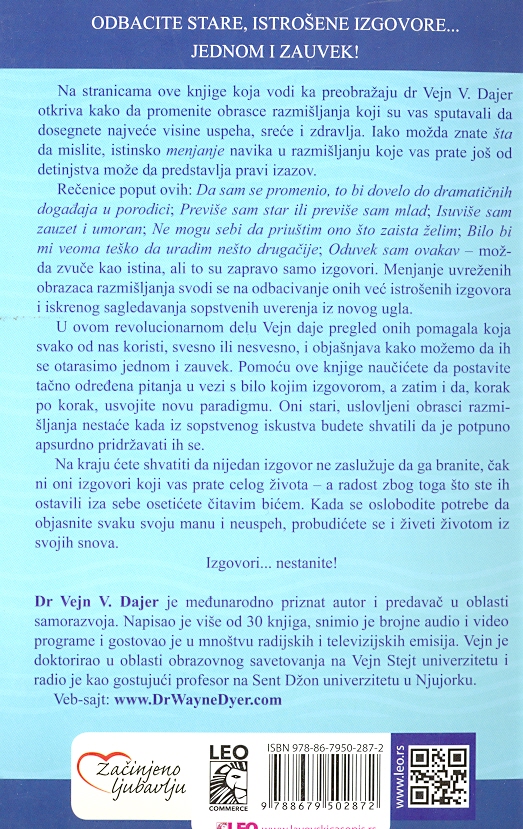Rečenice poput ovih: Da sam se promenio, to bi dovelo do dramatičnih događaja u porodici... Previše sam star ili previše sam mlad... Isuviše sam zauzet i umoran... Ne mogu sebi da priuštim ono što zaista želim... Bilo bi mi veoma teško da uradim nešto drugačije... i Oduvek sam ovakav... možda zvuče kao istina, ali to su zapravo samo izgovori. Menjanje uvreženih obrazaca razmišljanja svodi se na odbacivanje onih već istrošenih izgovora i iskrenog sagledavanje sopstvenih uverenja iz novog ugla.