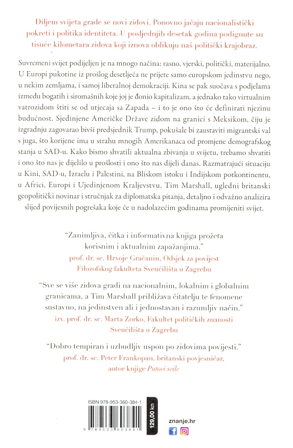 Knjiga takođe kontemplira o povijesnoj ulozi zidova – od Kineskog zida, Hadrijanovog zida, do Berlinskog zida – analizirajući kako su se razlozi i posledice izgradnje zidova menjali kroz vreme. Marshall ukazuje na to da, dok su zidovi nekad služili kao odbrana čitavih zajednica, danas često predstavljaju simbole dubokih društvenih, ekonomskih i političkih raskola. On naglašava da je više od polovine svih granica izgrađenih nakon Drugog svetskog rata podignuto u poslednjih dvadeset godina, što ukazuje na sve veći trend izolacionizma i securitizacije.