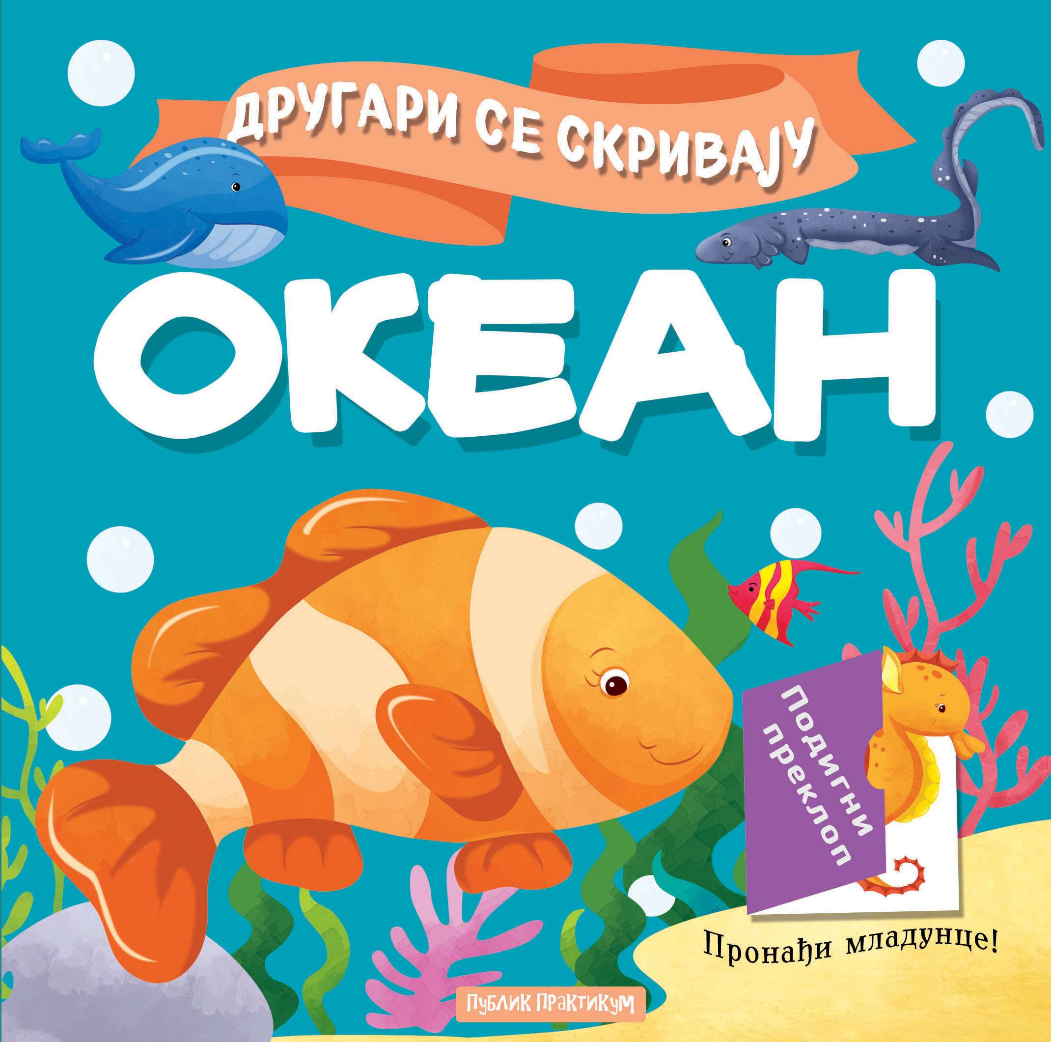 Kroz interaktivni format sa prozorčićima koje mališani otvaraju kako bi otkrili gde se kriju mladunci, deca prate morskog konjića, ribu klovna, kita, foku i pingvina u njihovoj potrazi za bebama. Svaka stranica krije ne samo simpatične ilustracije, već i dragocene informacije o izgledu i staništu morskih životinja, podstičući prirodnu radoznalost i želju za istraživanjem.