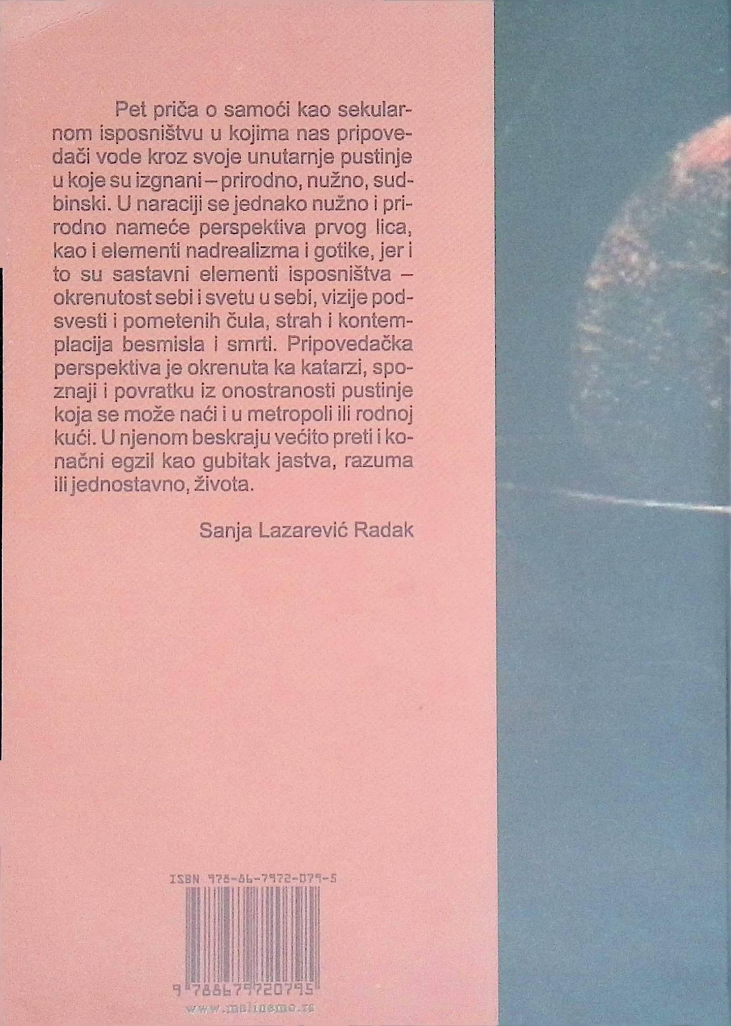 ’’Nova knjiga prošlogodišnjeg dobitnika Nagrade Mali Nemo. Pet priča o samoći kao svetovnom isposništvu. Pripovedač pripoveda iz perspektive prvog lica, uključuje iskustva nadrealizma i gotike, kao iskustva isposništva okrenutost sebi i svetu u sebi, vizijama podsvesti i pometenih čula, strahu i kontemplaciji besmisla i smrti. Pripovedačka perspektiva je usmerena ka katarzi, povratku iz onostranosti pustinje u kojoj se čitalac ili pisac mogu zateći i u metropoli ili rodnoj kući.’’
