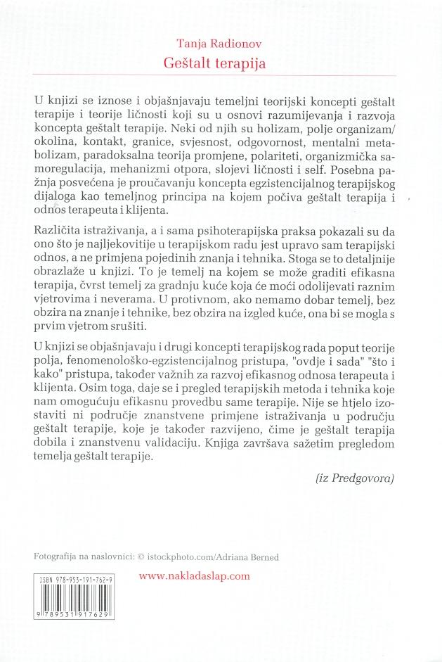 U knjizi se objašnjavaju i drugi koncepti terapijskog rada poput teorije polja, fenomenološko-egzistencijalnog pristupa, „ovdje i sada“ „što i kako“ pristupa, također važnih za razvoj efikasnog odnosa terapeuta i klijenta. Osim toga, daje se i pregled terapijskih metoda i tehnika koje nam omogućuju efikasnu provedbu same terapije. Nije se htjelo izostaviti ni područje znanstvene primjene istraživanja u području geštalt terapije, koje je također razvijeno, čime je geštalt terapija dobila i znanstvenu validaciju. Knjiga završava sažetim pregledom temelja geštalt terapije.