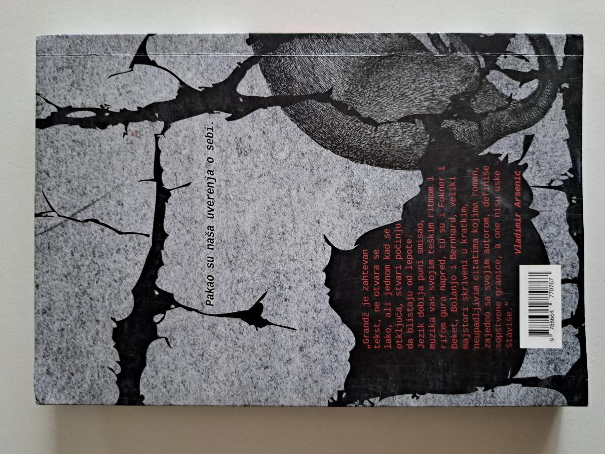 Grandž je zahtevan tekst, ne otvara se lako, ali jednom kad se otključa, stvari počinju da blistaju od lepote. Jezik dobija puni smisao, muzika vas svojim teškim ritmom i rifom gura napred, tu su i Fokner i Beket, Bolanjo i Bernhard, veliki majstori skriveni u kratkim, neupadljivim citatima kojima roman, zajedno sa svojim autorom, definiše sopstvene granice, a one nisu uske – štaviše. Otvorite se za Grandž, pustite da vas ponesu glasovi Edija Vedera i Kurta Kobejna. Nećete se pokajati, nimalo.