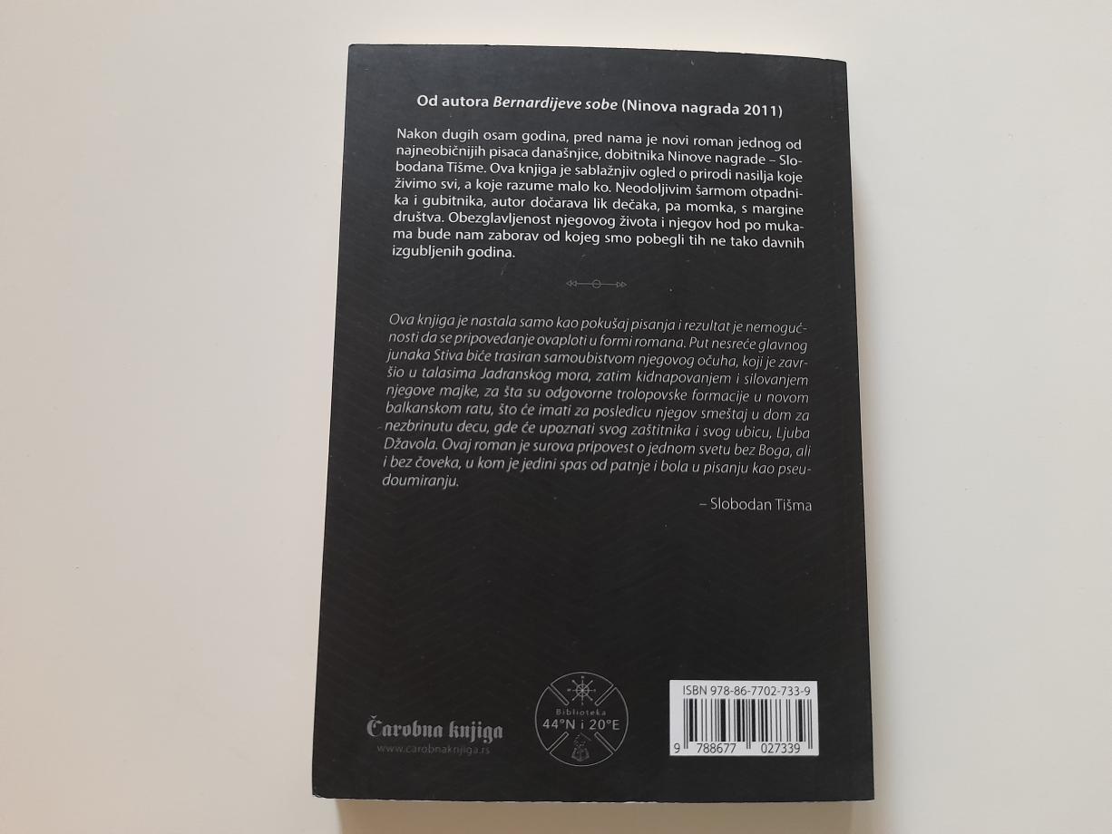 Nakon dugih osam godina, pred nama je novi roman jednog od najneobičnijih pisaca današnjice, dobitnika Ninove nagrade - Slobodana Tišme. Ova knjiga je sablažnjiv ogled o prirodi nasilja koje živimo svi, a koje razume malo ko. Neodoljivim šarmom otpadnika i gubitnika, autor dočarava lik dečaka, pa momka, s margine društva. Obezglavljenost njegovog života i njegov hod po mukama bude nam zaborav od kojeg smo pobegli tih ne tako davnih izgubljenih godina.