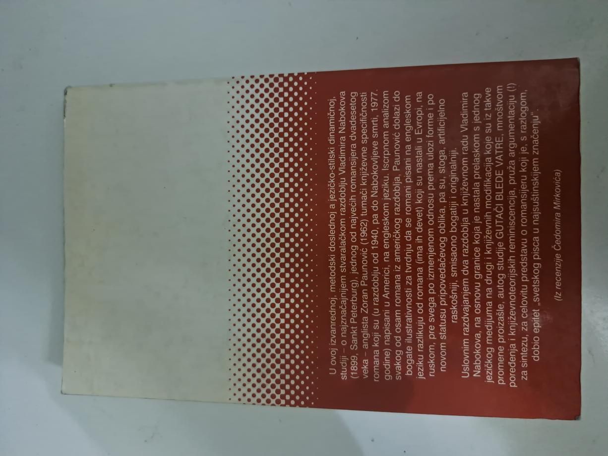 U ovoj izvanrednoj, metodski doslednoj a jezičko-stilski dinamičnoj, studiji - o najznačajnijem stvaralačkom razdoblju Vladimira Nabokova (1899, Sankt Peterburg), jednog od najvećih romansijera dvadesetog veka - anglista Zoran Paunović (1962) tumači književne specifičnosti romana koji su (u razdoblju od 1940, pa do Nabokovljeve smrti, 1977. godine) napisani u Americi, na engleskom jeziku. Iscrpnom analizom svakog od osam romana iz američkog razdoblja, Paunović dolazi do bogate ilustrativnosti za tvrdnju da se romani pisani na engleskom jeziku razlikuju od romana (ima ih devet) koji su nastali u Evropi, na ruskom, pre svega po izmenjenom odnosu prema ulozi forme i po novom statusu pripovedačevog oblika, pa su, stoga, artificijelno raskošniji, smisaono bogatiji i originalniji.
