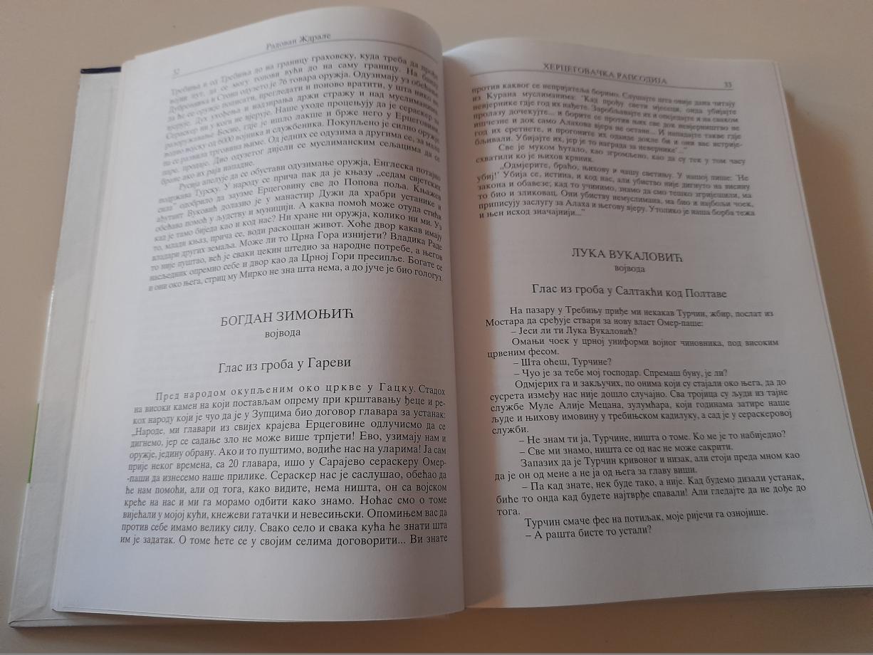 Literarno oblikovanje i saopštavanje autentičnih istorijskih događaja (ustanci u Hercegovini protiv Turaka 1852-1878. godine), pri čemu je istorijska faktografija znalački obogaćena umetničkom imaginacijom i stvaralačkom maštovitošću, što tvori skladno epsko-lirsku kompoziciju, koja se prima kroz uzvišena osećanja srca i duše`