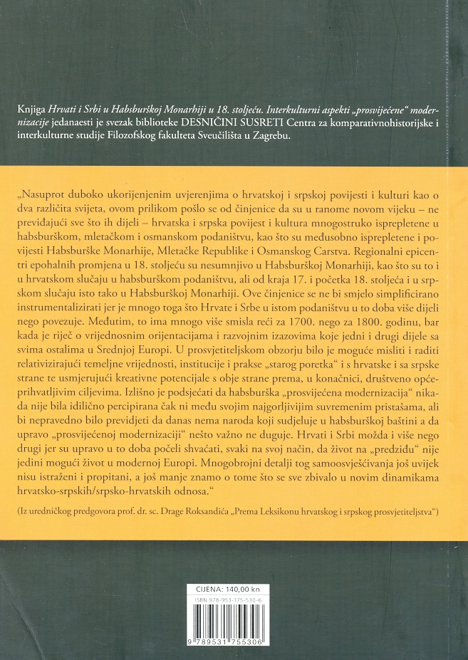 „Nasuprot duboko ukorijenjenim uvjerenjima o hrvatskoj i srpskoj povijesti i kulturi kao o dva različita svijeta, ovom prilikom pošlo se od činjenice da su u ranome novom vijeku - ne previđajući sve što ih dijeli - hrvatska i srpska povijest i kultura mnogostruko isprepletene u habsburškom, mletačkom i osmanskom podaništvu, kao što su međusobno isprepletene i povijesti Habsburške Monarhije, Mletačke Republike i Osmanskog Carstva. Regionalni epicentri epohalnih promjena u 18. stoljeću su nesumnjivo u Habsburškoj Monarhiji, kao što su to i u hrvatskom slučaju u habsburškom podaništvu, ali od kraja 17. i početka 18. stoljeća i u srpskom slučaju isto tako u Habsburškoj Monarhiji. Ove činjenice se ne bi smjelo simplificirano instrumentalizirati jer je mnogo toga što Hrvate i Srbe u istom podaništvu u to doba više dijeli nego povezuje. Međutim, to ima mnogo više smisla reći za 1700. nego za 1800. godinu, bar kada je riječ o vrijednosnim orijentacijama i razvojnim izazovima koje jedni i drugi dijele sa svima ostalima u Srednjoj Europi. U prosvjetiteljskom obzorju bilo je moguće misliti i raditi relativizirajući temeljne vrijednosti, institucije i prakse „starog poretka“ i s hrvatske i sa srpske strane te usmjerujući kreativne potencijale s obje strane prema, u konačnici, društveno opće- prihvatljivim ciljevima. Izlišno je podsjećati da habsburška „prosvijećena modernizacija“ nikada nije bila idilično percipirana čak ni među svojim najgorljivijim suvremenim pristašama, ali bi nepravedno bilo previdjeti da danas nema naroda koji sudjeluje u habsburškoj baštini a da upravo „prosvijećenoj modernizaciji" nešto važno ne duguje. Hrvati i Srbi možda i više nego drugi jer su upravo u to doba počeli shvaćati, svaki na svoj način, da život na ,,predziđu“ nije jedini mogući život u modernoj Europi. Mnogobrojni detalji tog samoosvješćivanja još uvijek nisu istraženi i propitani, a još manje znamo o tome što se sve zbivalo u novim dinamikama hrvatsko-srpskih/srpsko-hrvatskih odnosa. “