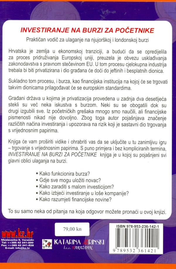 Građani država u kojima je privatizacija provedena u zadnja dva desetljeća stekli su već neka iskustva s burzom. Neki su se obogatili dok su drugi izgubili sve. Iz početničkih grešaka mnogo smo naučili, ali financijske pismenosti nikad nije dovoljno. Zbog toga autor pojašnjava značenje različitih načina investiranja i upozorava na rizik koji je sastavni dio trgovanja s vrijednosnim papirima.