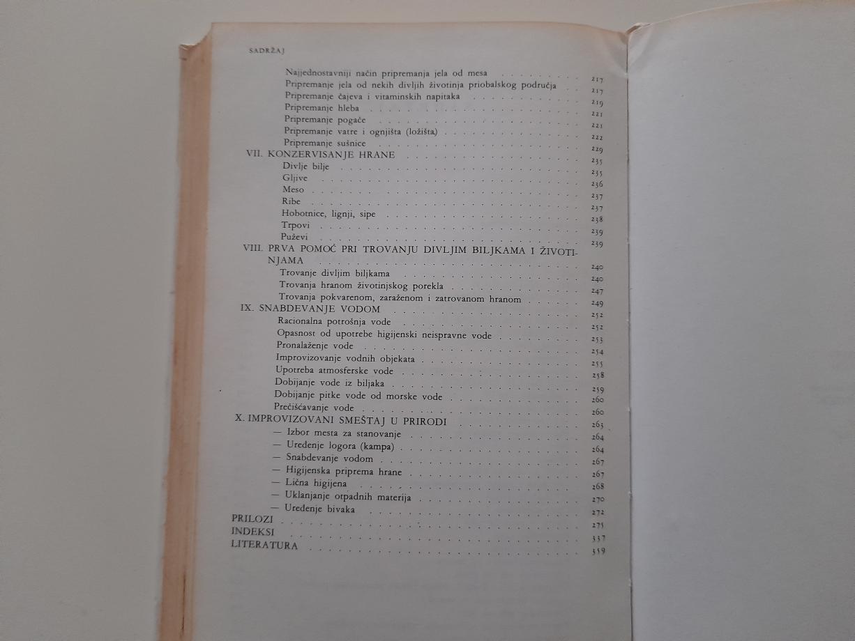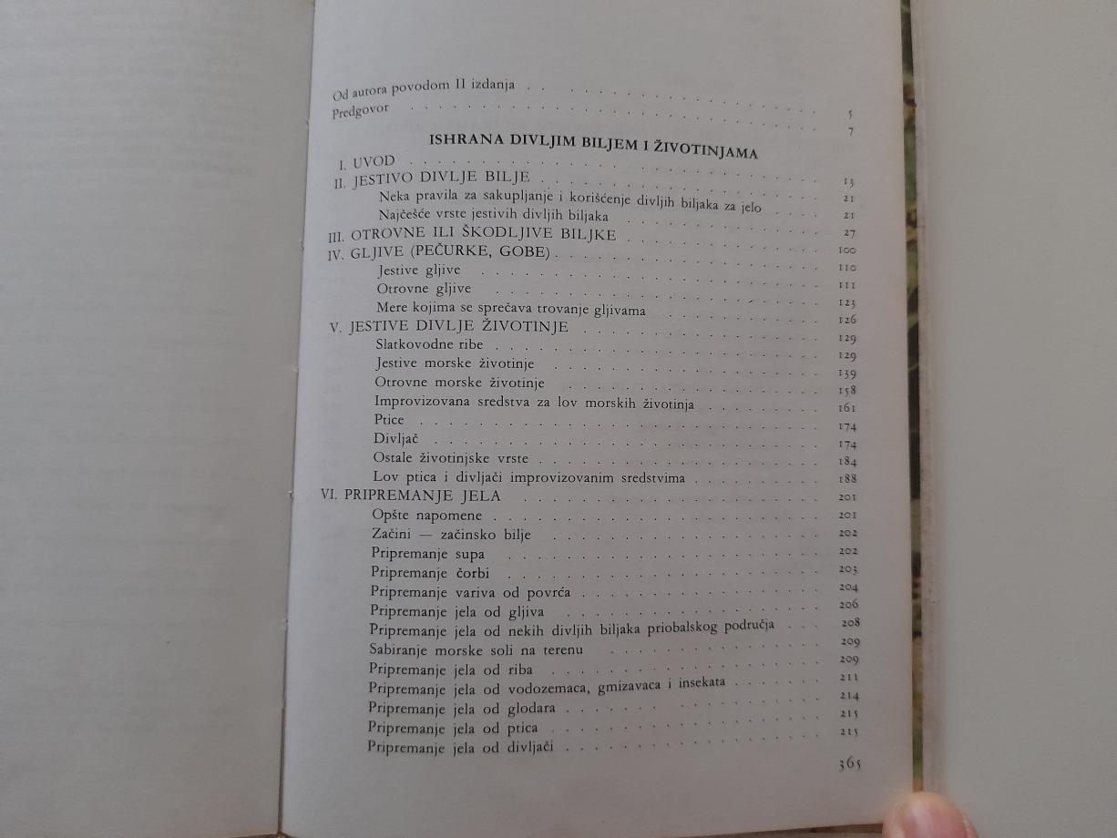 Koncepcija i namena drugog izdanja ove knjige ostale su iste, ali je ono dopunjeno u skladu sa novim saznanjima do kojih smo došli u radu na ovim pitanjima i sa predlozima čitalaca. Poglavlje »Jestivo divlje bilje« dopunjeno je novim vrstama. Bolje su sistematizovana i dopunjena poglavlja »Jestive morske životinje« i »Improvizovana sredstva za lov morskih životinja«. Na bazi novijih rezultata ispitivanja revidirana je i dopunjena tablica vitaminskih vrednosti divljeg bilja i unete su tablice o hemijskom sastavu i kaloričnoj vrednosti divljih biljaka i gljiva.