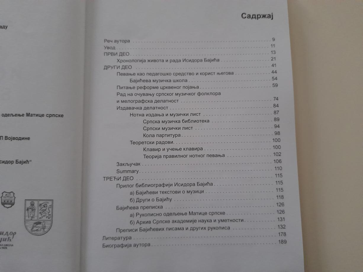 Kao što to već i sam naslov sugeriše, u studiji se u centru pažnje nalazi Bajićeva manje poznata pedagoška, melografska i izdavačka delatnost. Iako je njegovo kompozitorsko stvaralaštvo, kao jedan od poslednjih odblesaka romantizma u srpskoj muzici” oduvek bilo zanimljivo, autorka smatra da su ranije navedeni segmenti značajniji u pogledu razvoja muzičke kulture u Vojvodini. Knjigu čine tri celine: u prvom delu navedeni su izvori za istraživanje i hronologija životnog puta Isidora Bajića; u drugom, centralnom delu, predstavljena je njegova pedagoška, melografska i izdavačka delatnost; treći deo sadrži bibliografiju i dostupnu arhivsku građu.