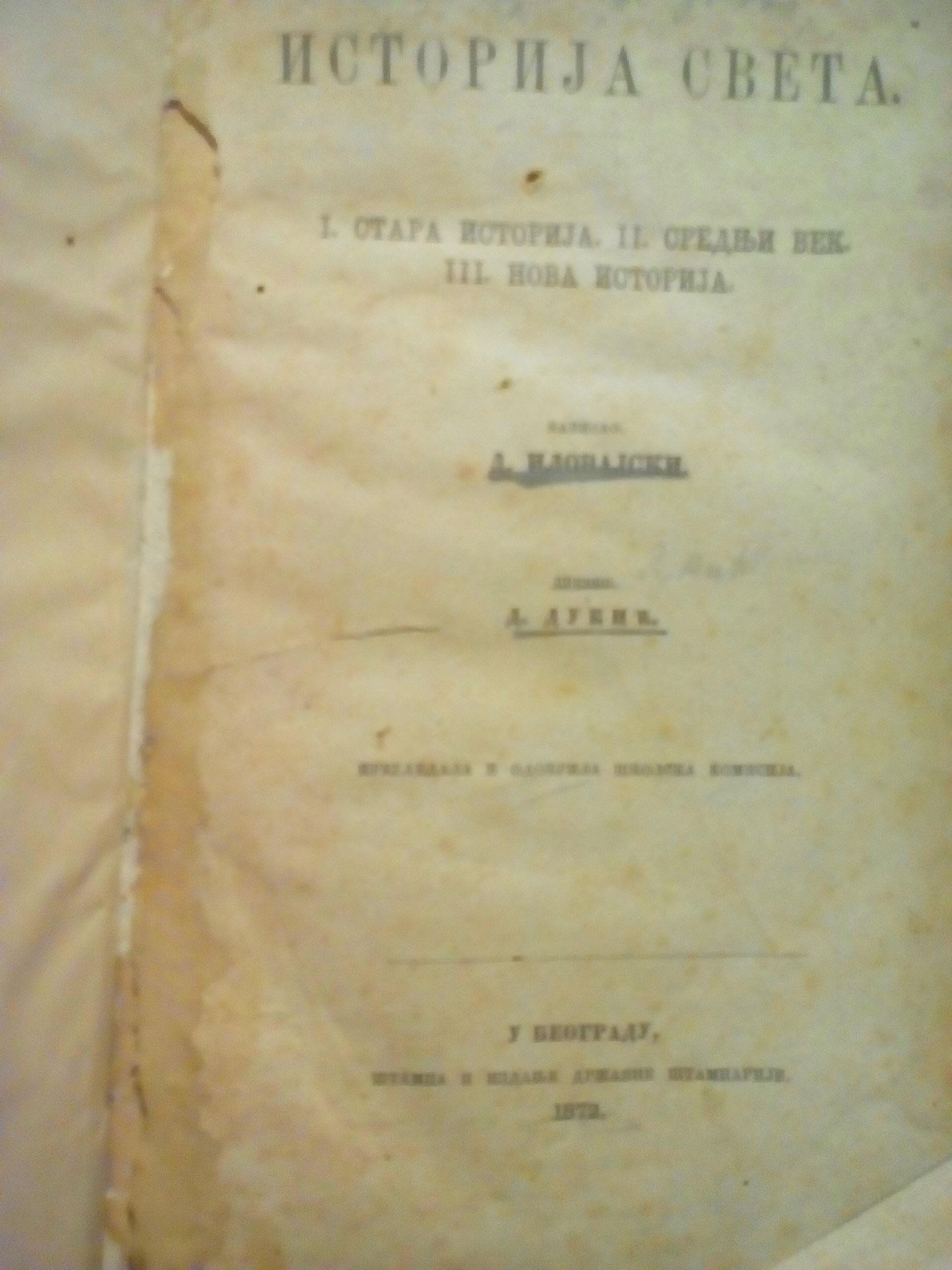 Knjiga je stampana u Drzavnoj stampariji 1872 godine, tvrd povez, cirilica. Na knjizi su primetni tragovi proslosti.