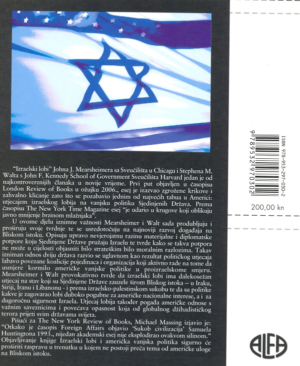 U ovome djelu iznimne važnosti Mearsheimer i Walt sada produbljuju i proširuju svoje tvrdnje te se usredotočuju na najnoviji razvoj događaja na Bliskom istoku. Opisuju upravo nevjerojatnu razinu materijalne i diplomatske potpore koju Sjedinjene Države pružaju Izraelu te tvrde kako se takva potpora ne može u cijelosti objasniti bilo strateškim bilo moralnim razlozima. Takav izniman odnos dviju država razvio se uglavnom kao rezultat političkog utjecaja labavo povezane koalicije pojedinaca i organizacija koji aktivno rade na tome da usmjere kormilo američke vanjske politike u proizraelskome smjeru.