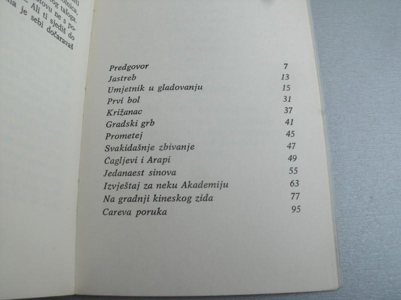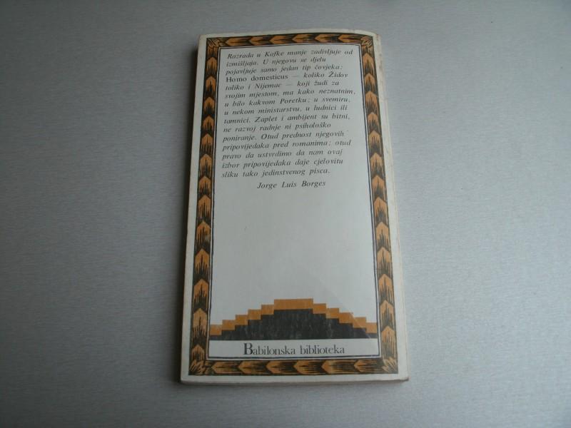 Najneospornija Kafkina vrlina je otkriće nepodnošljivih situacija. Dovoljno mu je tek nekoliko redaka da bi stvorio nezaboravnu sliku. Na primer: „Životinja istrgne bič iz ruku svoga gospodara i kažnjava se da bi se pretvorila u gospodara, a ne shvata da je to samo privid stvoren jednim novim čvorom na biču.“ Ili: „U hram nagrnu leopardi i piju vino iz pehara; događaj se ponavlja; na kraju se može predvideti da će se dogoditi, pa je uključen u liturgiju hrama.“ Razrada kod Kafke manje zadivljuje od mašte. U njegovom delu se pojavljuje samo jedan tip čoveka: Homo-domesticus - koliko Jevrej, toliko i Nemac - koji čezne za svojim mestom, makar sitnim, u bilo kakvom poretku: u svemiru, u nekom ministarstvu, u ludnici ili tamnici. Zaplet i ambijent su bitni, ne razvoj radnje, ni psihološko poniranje. Zato njegove pripovetke imaju prednost nad romanima; zato imamo pravo da tvrdimo da nam ovaj izbor pripovedaka daje celovitu sliku tako jedinstvenog pisca.