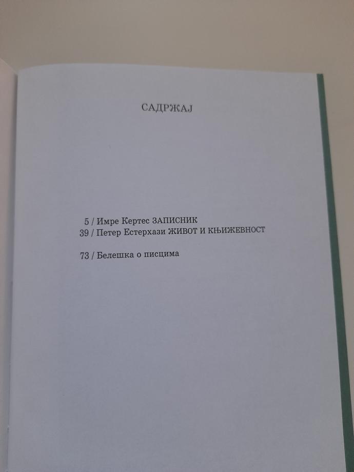 Tekst mađarskog nobelovca Imre Kertesa i njegovog mlađeg zemljaka Petera Esterhaza objedinjeni su istom temom i istim doživljajem koji su dva pisca doživela nezavisno u različitim vremenima: prelazak granice i tretman putnika jedne totalitarne zemlje oličene u pograničnim vlastima. Ova knjiga neodoljivo podseća na našu svakodnevicu i na sva poniženja koja trpimo pri prelasku državne granice. Dragocen prevod za naše čitaoce kojima će ova knjiga biti draga i više nego aktuelna.