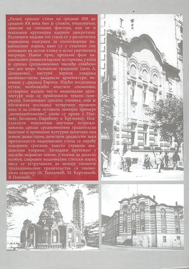 Među različitim stilskim opredeljenjima koja su obeležila srpsku arhitekturu novijeg doba, jedno od najznačajnijih nesumnjivo je ono koje se može okarakterisati kao srpski nacionalni stil. Začeta kao tipičan izraz epohe romantičarskog istorizma u srpskoj umetnosti sredinom XIX veka, ideja stvaranja nacionalnog stila održala se u našoj arhitekturi u različitim vidovima do današnjeg dana.