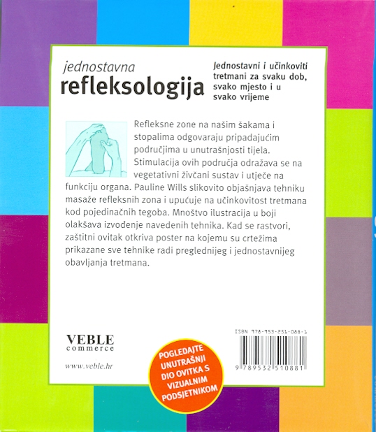 Refleksne zone na našim šakama i stopalima odgovaraju pripadajućim područjima u unutrašnjosti tijela. Stimulacija ovih područja odražava se na vegetativni živčani sustav i utječe na funkciju organa. Pauline Wills u ovoj knjizi slikovito objašnjava tehniku masaže refleksnih zona i upućuje na učinkovitost tretmana kod pojedinačnih tegoba. Mnoštvo ilustracija u boji olakšava izvođenje navedenih tehnika. Kad se rastvori zaštitni ovitak otkriva poster na kojemu su crtežima prikazane sve tehnike radi preglednijeg i jednostavnijeg obavljanja tretmana.