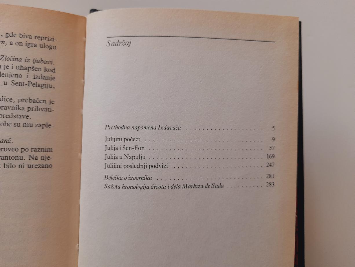 Knjiga detaljno opisuje putovanje Julije kroz razvrat, zločine i izopačenost, gde ona biva nagrađena za svoje postupke. Predstavlja mračnu satiru morala, libertinizam i filozofiju da porok vodi do prosperiteta.