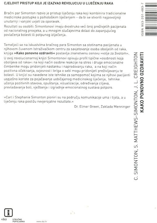 Bračni par Simonton razvio je pristup liječenju raka koji kombinira tradicionalne medicinske postupke s psihološkim liječenjem - da bi se stvorili najpovoljniji unutarnji i vanjski uvjeti za oporavak. Rezultati su osobiti: Simontonovi imaju dvostruko veći broj preživjelih pacijenata od nacionalnog prosjeka, a u mnogim slučajevima dolazi do zapanjujućeg povlačenja bolesti ili potpunog izlječenja. Temeljeći se na iskustvima bračnog para Simonton sa stotinama pacijenata u njihovom čuvenom Istraživačkom centru za savjetovanje osoba oboljelih od raka, knjiga »Kako ponovno ozdraviti« postavlja znanstvenu osnovu »volje za životom«. U ovoj revolucionarnoj knjizi Simontonovi opisuju profil tipične »osobnosti koja obolijeva od raka«: na koji način osobne reakcije na stres i druge emocionalne čimbenike mogu pridonijeti nastanku i napredovanju raka, a na koji način pozitivna očekivanja, svjesnost i briga o sebi mogu pridonijeti preživljavanju te bolesti. U knjizi su navedene iste tehnike za samopornoć kojima se njihovi pacijenti uspješno koriste za pojačavanje uobičajenog medicinskog liječenja, tehnike učenja pozitivnih stavova, opuŠtanja, vizualizacije, određivanja ciljeva, prevladavanja boli, vježbanja i izgradnje emocionalnog sustava potpore.