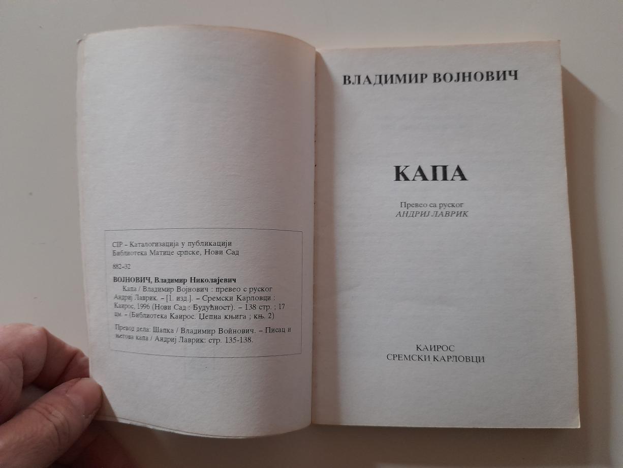 Vladimir Vojnović je prevashodno poznat kao pisac proze. Svetsku slavu stekao je romanom Život i priključenije vojnika Ivana Čonkina. Autor je niza proznih dela: Pretendent na presto: nova priključenija vojnika Ivana Čonkina, Ivankijada, Hoću da budem pošten, Rastojanje od pola kilometra, U kupeu spavaćih kola i dr. Većinu svojih dela objavio je na Zapadu, zbog ranog sukoba sa sovjetskim vlastima. Kapa V. Vojnovića, u duhu njegovih briljantnih i satiričnih povesti o vojniku Čonkinu, u središte pažnje stavlja Jefima Rahljina, polujevrejina i malog pisca, i njegovo nastojanje da u raspodeli Saveza pisaca dobije kapu primerenu njegovom zamišljenom književnom značaju i talentu. Iz ovog sukoba predstave o sebi i ideologizirane stvarnosti, kapa postaje metafora ispod koje se otkriva tragična i gorko komična stvarnost jednog sistema i uboga uloga pojedinca i njegova borba za prava na postojanje. Kapa je izvanredan primer univerzalizma satirične književnosti.