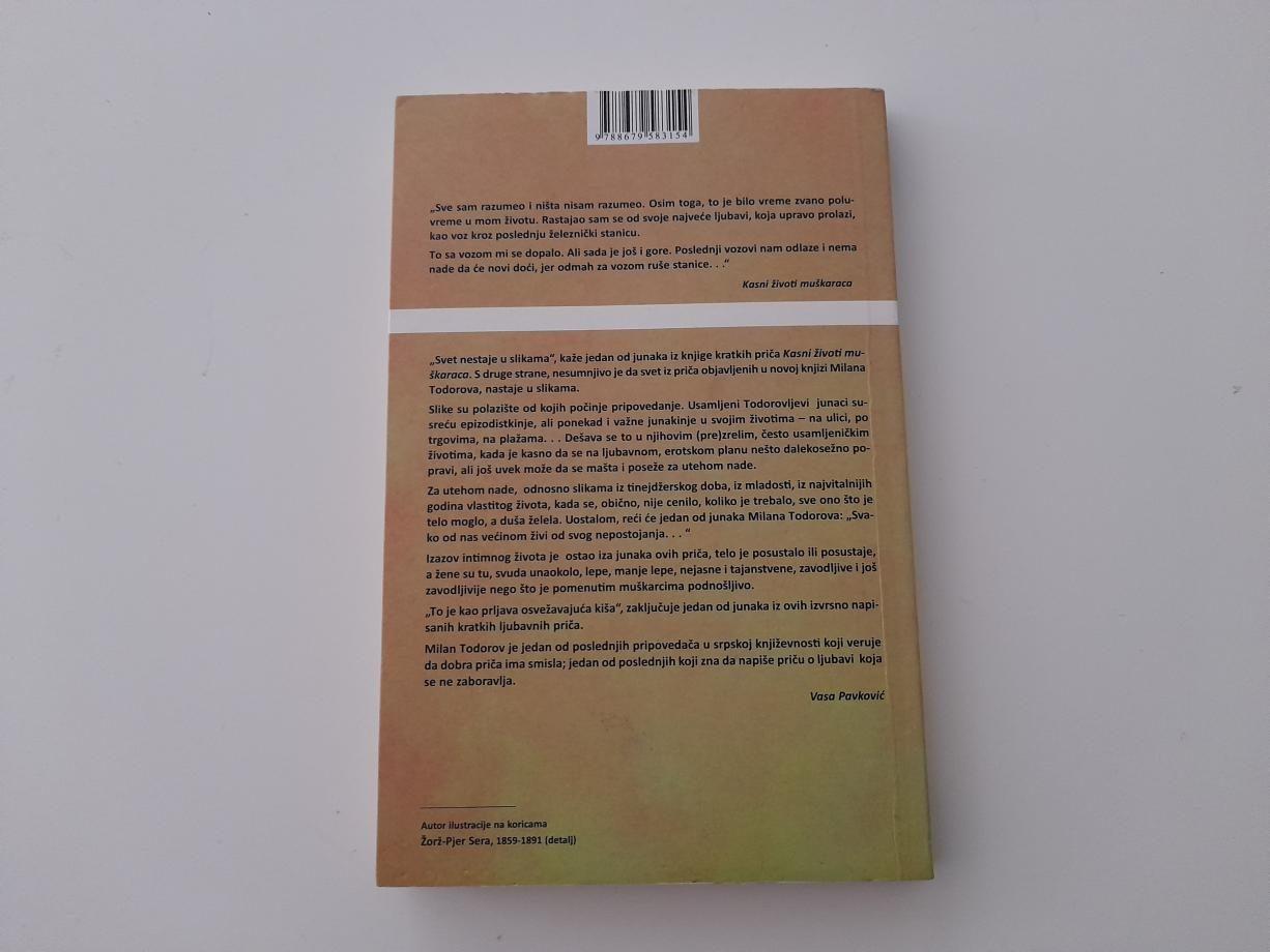 „Svet nestaje u slikama“, kaže jedan od junaka iz knjige kratkih priča Kasni životi muškaraca. S druge strane, nesumnjivo je da svet iz priča objavljenih u novoj knjizi Milana Todorova, nastaje u slikama. Slike su polazište od kojih počinje pripovedanje. Usamljeni Todorovljevi junaci susreću epizodistkinje, ali ponekad i važne junakinje u svojim životima - na ulici, po trgovima, na plažama. . . Dešava se to u njihovim (pre)zrelim, često usamljeničkim životima, kada je kasno da se na ljubavnom, erotskom planu nešto dalekosežno popravi, ali još uvek može da se mašta i poseže za utehom nade. Za utehom nade, odnosno slikama iz tinejdžerskog doba, iz mladosti, iz najvitalnijih godina vlastitog života, kada se, obično, nije cenilo, koliko je trebalo, sve ono što je telo moglo, a duša želela. Uostalom, reći će jedan od junaka Milana Todorova: „Svako od nas većinom živi od svog nepostojanja...“