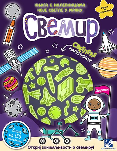 Knjiga sadrži 150 šarenih nalepnica, kao i 30 specijalnih nalepnica koje svetle u mraku, što dodatno povećava zabavu i interaktivnost. Namijenjena je deci predškolskog uzrasta, nudeći im uzbudljivo i edukativno iskustvo dok istražuju svemir.