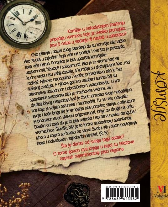 Ovo pitanje i dolazi zbog saznanja da su komšije bile važan deo života u zajednici koja više ne postoji. I sve što je postojalo, toga više nema. Porodica je bila uporište komšijske uzajamnosti, bliskosti i solidarnosti. Bilo je to vreme kad se kućna vrata nisu zaključavala, a komšije su doživljavane kao „rod rođeni“. Njihovo nacionalno i versko pripadništvo bilo je bez ikakvog značaja. A njihovi gotovo ustaljeni susreti bili su alternativa dosadnom i obezličenom svakodnevlju.