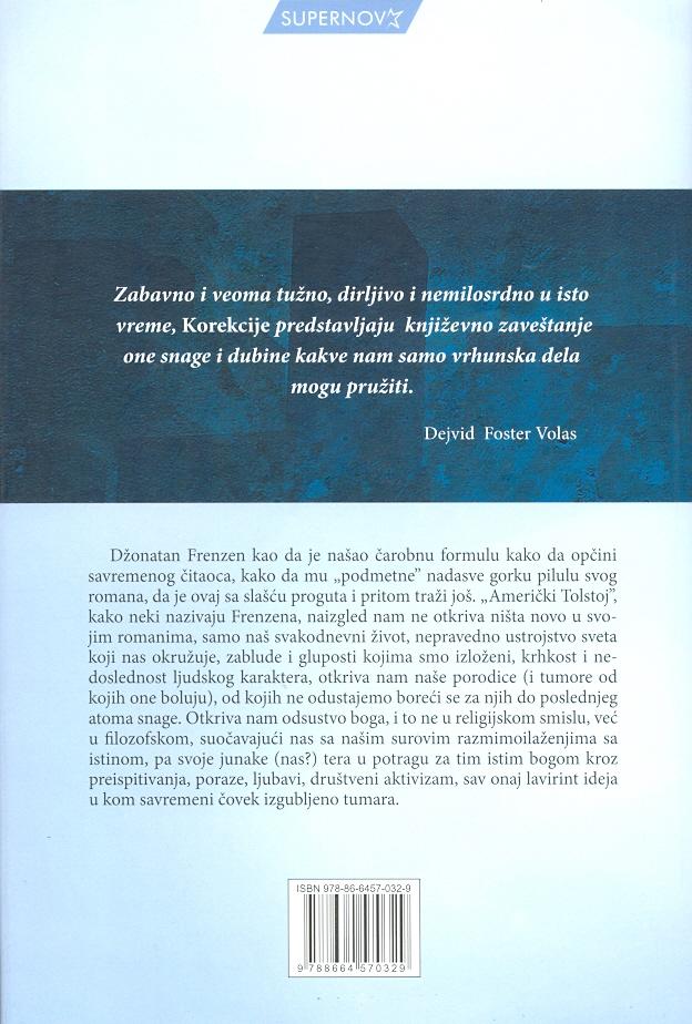 Američki Tolstoj, kako mnogi zovi Džonatana Frenzena, u novom romanu Korekcije bavi se tipičnom, modernom američkom porodicom, koja daje zadnje nade da će se okupiti. To i čini, a onda na površinu izbijaju sve stvari koje čine tipičnu američku porodicu savremenog doba.
